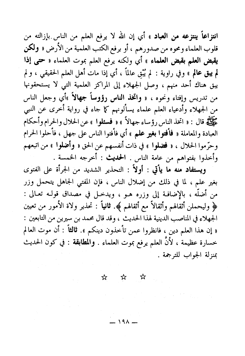 انتزاعاً ينتزعه من العباد" أي إن الله لا يرفع العلم من الناس بإزالته من قلوب العلماء ومحوه من صدورهم، أو برفع الكتب العلمية من الأرض " ولكن يقبض العلم بقبض العلماء " أي ولكنه يرفع العلم بموت العلماء " حتى إذا لم يبق عالم " وفي راوية: لم يُبْقِ عالماً، أي إذا مات أهل العلم الحقيقي، ولم يبق هناك أحد منهم، وصل الجهلاء إلى المراكز العلمية التي لا يستحقونها من تدريس وإفتاء ونحوه، " واتخذ الناس رؤوساً جهالاً " أي وجعل الناس من الجهلاء وأدعياء العلم علماء يسألونهم كما جاء في رواية أخرى عن النبي - صلى الله عليه وسلم - قال: " اتخذ الناس رؤساء جهالاً " " فسئلوا " عن الحلال والحرام وأحكام العبادة والمعاملة " فأفتوا بغير علم " أي فأفتوا الناس على جهل، فأحلوا الحرام وحرّموا الحلال، " فضلوا " في ذات أنفسهم عن الحق " وأضلوا " من اتبعهم وأخذوا بفتواهم من عامة الناس. الحديث: أخرجه الخمسة.