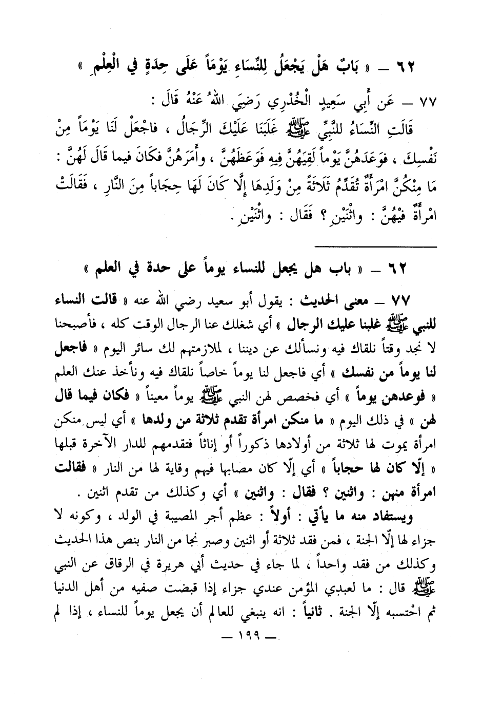 قَالَتِ "النِّسَاءُ للنَّبِيِّ - صلى الله عليه وسلم - غَلَبَنَا عَلَيْكَ الرِّجَالُ، فاجْعَلْ لَنَا يَوْمَاً مِنْ نَفْسِكَ، فوَعَدَهُنَّ يَوْماً لَقِيَهُنَّ فِيهِ فَوَعَظَهُنَّ، وأمَرَهُنَّ فكَانَ فيما قَالَ لَهُنَّ: مَا مِنْكُنَّ امْرأةٌ تُقَدِّمُ ثَلَاثَةً مِنْ وَلَدِهَا إِلَّا كَانَ لَهَا حِجَاباً مِنَ النَّارِ، فَقَالَتْ امْرأةٌ فيْهُنَّ: واثْنَيْنِ؟ فَقَال: واثْنَيْنِ.
