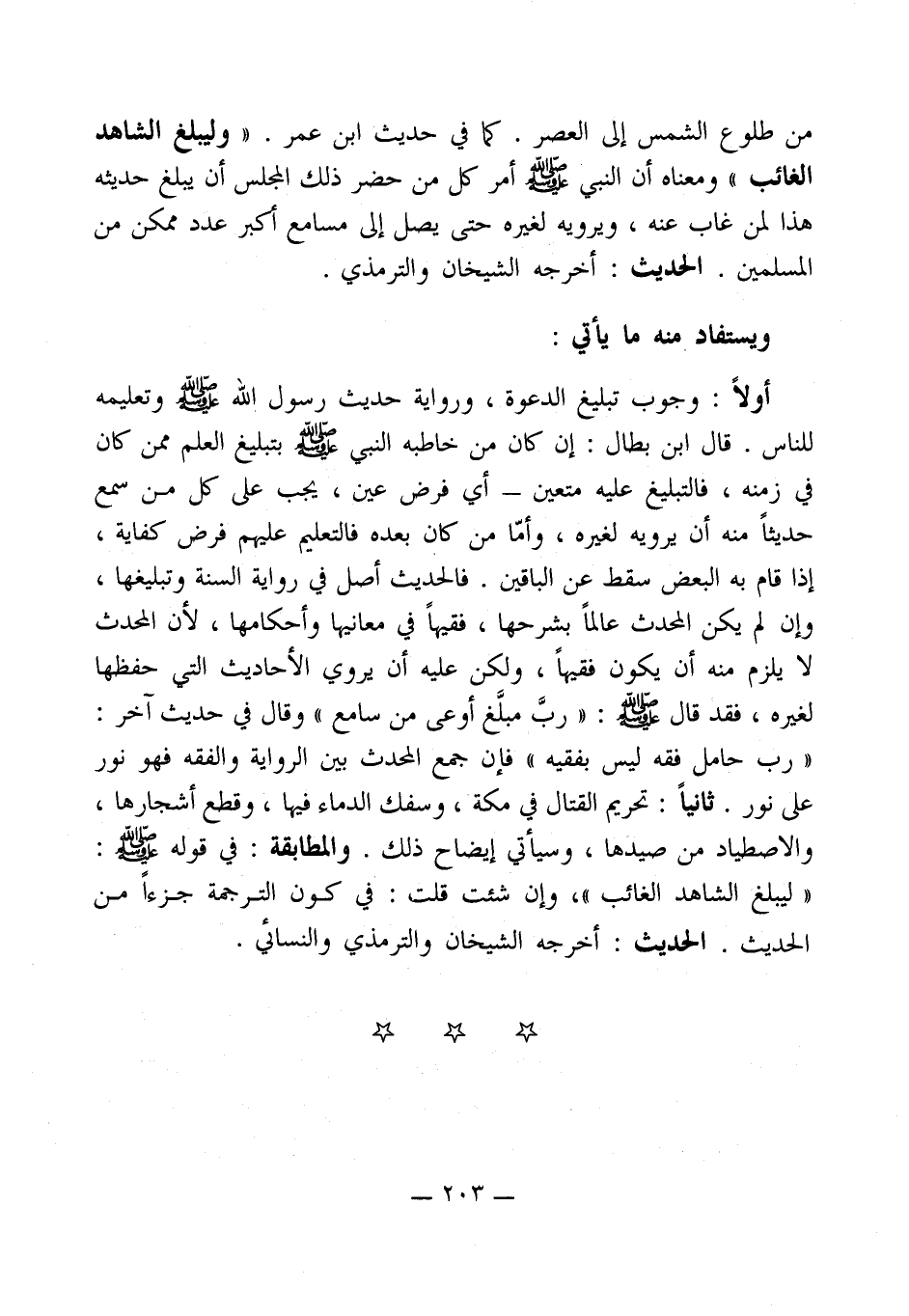 من طلوع الشمس إلى العصر. كما في حديث ابن عمر. " وليبلغ الشاهد الغائب " ومعناه أن النبي - صلى الله عليه وسلم - أمر كل من حضر ذلك المجلس أن يبلغ حديثه هذا لمن غاب عنه، ويرويه لغيره حتى يصل إلى مسامع أكبر عدد ممكن من المسلمين. الحديث: أخرجه الشيخان والترمذي.