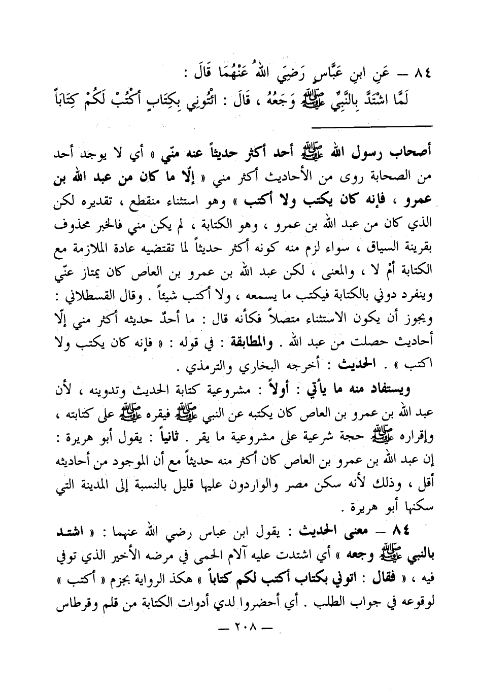 84 - معنى الحديث: يقول ابن عباس رضي الله عنهما: " اشتد بالنبي - صلى الله عليه وسلم - وجعه " أي اشتدت عليه آلام الحمى في مرضه الأخير الذي توفي فيه، " فقال: اتوني بكتاب أكتب لكم كتاباً " هكذ الرواية بجزم " أكتب " لوقوعه في جواب الطلب. أي أحضروا لدي أدوات الكتابة من قلم وقرطاس