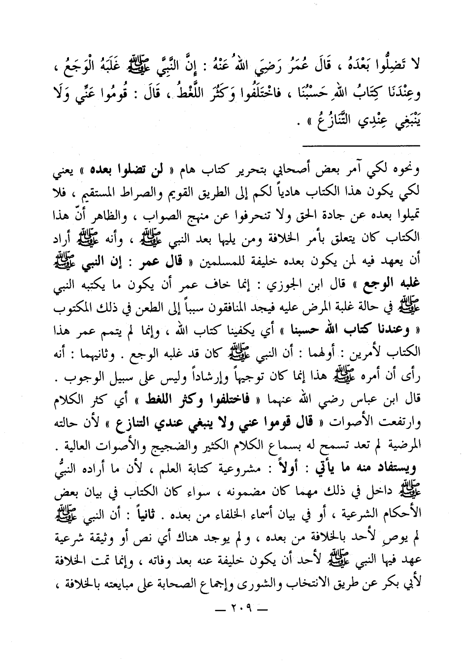 ونحوه لكي آمر بعض أصحابي بتحرير كتاب هام " لن تضلوا بعده " يعني لكي يكون هذا الكتاب هادياً لكم إلى الطريق القويم والصراط المستقيم، فلا تميلوا بعده عن جادة الحق ولا تنحرفوا عن منهج الصواب، والظاهر أنّ هذا الكتاب كان يتعلق بأمر الخلافة ومن يليها بعد النبي - صلى الله عليه وسلم -، وأنه - صلى الله عليه وسلم - أراد أن يعهد فيه لمن يكون بعده خليفة للمسلمين " قال عمر: إن النبي - صلى الله عليه وسلم - غلبه الوجع " قال ابن الجوزي: إنما خاف عمر أن يكون ما يكتبه النبي - صلى الله عليه وسلم - في حالة غلبة المرض عليه فيجد المنافقون سبباً إلى الطعن في ذلك المكتوب " وعندنا كتاب الله حسبنا " أي يكفينا كتاب الله، وإنما لم يتمم عمر هذا الكتاب لأمرين: أولهما: أن النبي - صلى الله عليه وسلم - كان قد غلبه الوجع. وثانيهما: أنه رأى أن أمره - صلى الله عليه وسلم - هذا إنما كان توجيهاً وإرشاداً وليس على سبيل الوجوب.