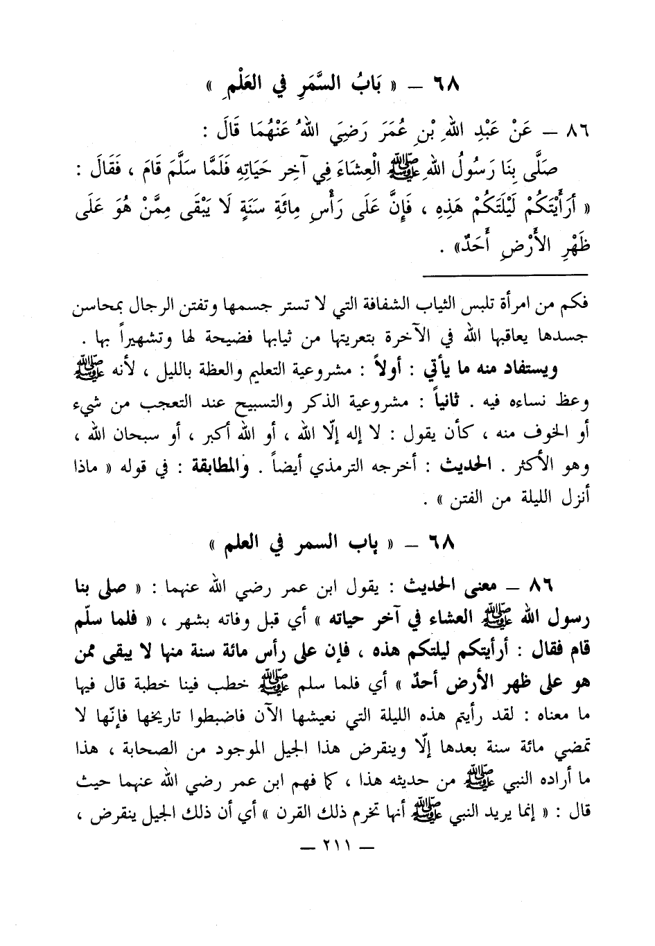 86 - معنى الحديث: يقول ابن عمر رضي الله عنهما: " صلى بنا رسول الله - صلى الله عليه وسلم - العشاء في آخر حياته " أي قبل وفاته بشهر، " فلما سلّم قام فقال: أرأيتكم ليلتكم هذه، فإن على رأس مائة سنة منها لا يبقى ممن هو على ظهر الأرض أحدٌ " أي فلما سلم - صلى الله عليه وسلم - خطب فينا خطبة قال فيها ما معناه: لقد رأيتم هذه الليلة التي نعيشها الآن فاضبطوا تاريخها فإنّها لا تمضي مائة سنة بعدها إلاّ وينقرض هذا الجيل الموجود من الصحابة، هذا ما أراده النبي - صلى الله عليه وسلم - من حديثه هذا، كما فهم ابن عمر رضي الله عنهما حيث قال: " إنما يريد النبي - صلى الله عليه وسلم - أنها تخرم ذلك القرن " أي أن ذلك الجيل ينقرض،