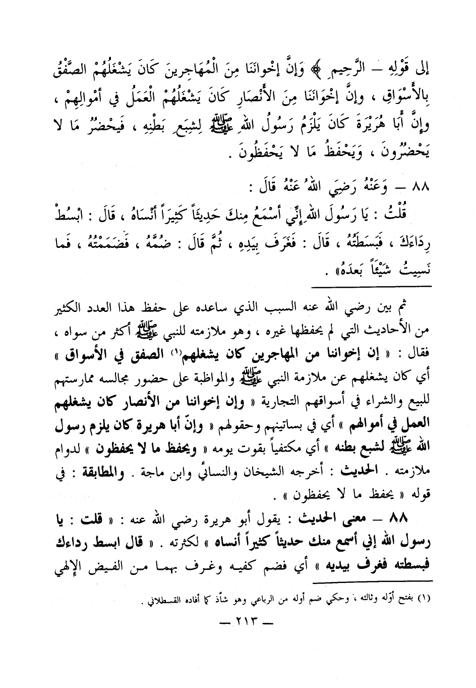 88 - معنى الحديث: يقول أبو هريرة رضي الله عنه: " قلت: يا رسول الله إني أسمع منك حديثاً كثيراً أنساه " لكثرته. " قال ابسط رداءك فبسطته فغرف بيديه " أي فضم كفيه وغرف بهما من الفيض الإِلهي