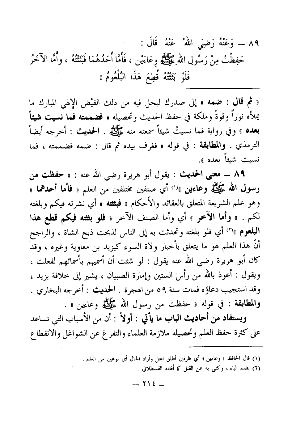 89 - معنى الحديث: يقول أبو هريرة رضي الله عنه: " حفظت من رسول الله - صلى الله عليه وسلم - وعاءين " (¬1) أي صنفين مختلفين من العلم " فأما أحدهما " وهو علم الشريعة المتعلق بالعقائد والأحكام " فبثثته " أي نشرته فيكم وبلغته لكم. " وأما الآخر " أي وأما الصنف الآخر " فلو بثثته فيكم قطع هذا البلعوم " (¬2) أي فلو بلغته وتحدثت به إلى الناس لذبحت ذبح الشاة، والراجح أنّ هذا العلم هو ما يتعلق بأخبار ولاة السوء كيزيد بن معاوية وغيره، وقد كان أبو هريرة رضي الله عنه يقول: لو شئت أن أسميهم بأسمائهم لفعلت، ويقول: أعوذ بالله من رأس الستين وإمارة الصبيان، يشير إلى خلافة يزيد، وقد استجيب دعاؤه فمات سنة 59 من الهجرة. الحديث: أخرجه البخاري.