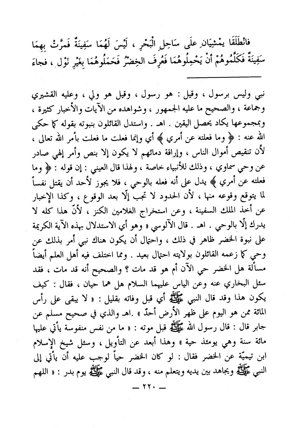 نبى وليس برسول، وقيل: هو رسول، وقيل هو ولي، وعليه القشيرى وجماعة، والصحيح ما عليه الجمهور، وشواهده من الآيات والأخبار كثيرة، وبمجموعها يكاد يحصل اليقين. اهـ. واستدل القائلون بنبوته بقوله كما حكى الله عنه: (وما فعلتة عن أمري) أي وإنما فعلت ما فعلت بأمر الله تعالى، لأن تنقيص أموال الناس، وإراقة دمائهم لا يكون إلا بنص وأمر إلهي صادر عن وحي سماوي، وذلك للأنبياء خاصة، ولهذا قال العيني: إن قوله: (وما فعلته عن أمري) يدل على أنه فعله بالوحي، فلا يجوز لأحد أن يقتل نفساً لما يتوقع وقوعه منها، لأن الحدود لا تجب إلاّ بعد الوقوع، وكذا الإِخبار عن أخذ الملك السفينة، وعن استخراج الغلامين الكنز، لأنّ هذا كله لا يدرك إلاّ بالوحي. اهـ. قال الآلوسي " وهو أي الاستدلال بهذه الآية الكريمة على نبوة الخضر ظاهر في ذلك، واحتمال أن يكون هناك نبي أمر بذلك عن وحي كما زعمه القائلون بولايته احتمال بعيد. ومما اختلف فيه أهل العلم أيضاً مسألة هل الخضر حي الآن أم هو قد مات؟ والصحيح أنه قد مات، فقد سئل البخاري عنه وعن الياس عليهما السلام هل هما حيان، فقال: كيف يكون هذا وقد قال النبي - صلى الله عليه وسلم - أي قبل وفاته بقليل: " لا يبقى على رأس المائة ممن هو اليوم على ظهر الأرض أحد ". اهـ والذي في صحيح مسلم عن جابر قال: قال رسول الله - صلى الله عليه وسلم - قبل موته: " ما من نفس منفوسة يأتي عليها مائة سنه وهي يومئذ حية " وهذا أبعد عن التأويل، وسئل شيخ الإِسلام ابن تيميّة عن الخضر فقال: لو كان الخضر حياً لوجب عليه أن يأتي إلى النبي - صلى الله عليه وسلم - ويجاهد بين يديه ويتعلم منه، وقد قال النبي - صلى الله عليه وسلم - يوم بدر: "اللهم