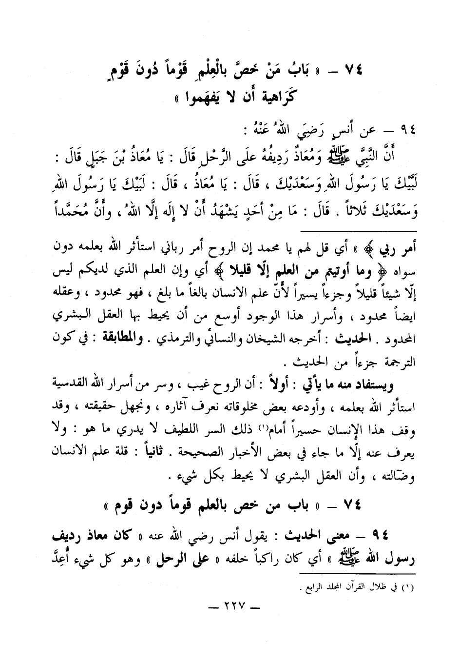 74 - " بَابُ مَنْ خصَّ بالْعِلْمِ قَوْماً دُونَ قَوْم كَرَاهية أن لا يَفهَموا "