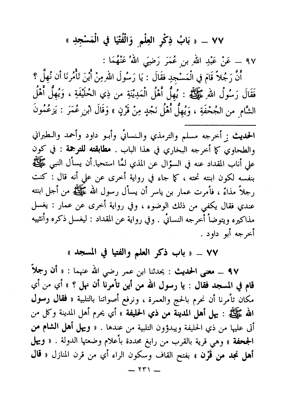 77 - " بَابُ ذِكْرِ العِلْمِ وَالْفُتْيَا في الْمَسْجِدِ "