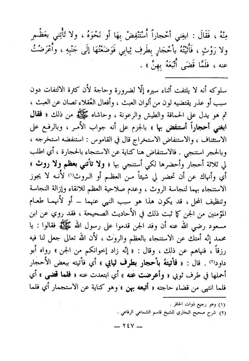 سلوكه أنه لا يلتفت أثناء سيره إلاّ لضرورة وحاجة لأن كثرة الالتفات دون سبب أو عذر يقتضيه لون من ألوان العبث، وأفعال العُقلاء تصان عن العبث، ثم هو يدل على الحماقة والطيش والرعونة، وحاشاه - صلى الله عليه وسلم - من ذلك " فقال ابغني أحجاراً أستنفض بها " بالجزم على أنه جواب الأمر، وبالرفع على الاستئناف، والاستنفاض الاستخراج قال في القاموس: استنفضه استخرجه، وبالحجر استنجي. فالاستنفاض هنا كناية عن الاستنجاء بالحجارة، أي اطلب لي ثلاثة أحجار وأحضرها لكي أستنجي بها " ولا تأتي بعظم ولا روث " أي وأنهاك عن أن تحضر لي شيئاً من العظم أو الروث (¬1) لأنه لا يجوز الاستنجاء بهما لنجاسة الروث، وعدم صلاحية العظم للانقاء وإزالة النجاسة وتنظيف المحل، قد يكون هذا هو سبب النهي عنهما - أو لأنهما طعام المؤمنين من الجن كما ثبت ذلك في الأحاديث الصحيحة، فقد روي عن ابن مسعود رضي الله عنه أن وفد الجن قدموا على رسول الله - صلى الله عليه وسلم - فقالوا: يا محمد إنه أمتك عن الاستنجاء بالعظم والروث، لأن الله تعالى جعل لنا فيه رزقاً، فنهاهم عن ذلك، وقال: " إنّه زاد إخوانكم من الجن " رواه أبو داود (¬2). قال: " فأتيتهُ بأحجار طرف ثيابي " أي فأتيته ببعض الأحجار أحملها في طرف ثوبي " وأعرضت عنه " أي ابتعدت عنه " فلما قضى " أي فلما انتهي من قضاء حاجته " أتبعه بهن " وهو كناية عن الاستجمار أي فلما