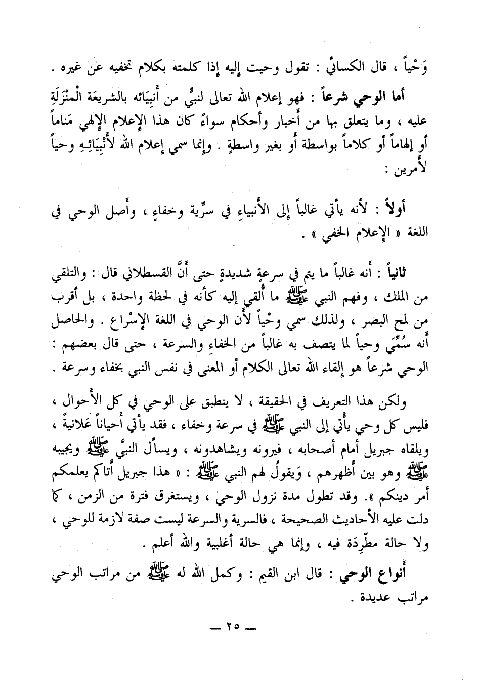 وَحْياً، قال الكسائي: تقول وحيت إليه إذا كلمته بكلام تخفيه عن غيره. أما الوحي شرعاً: فهو إعلام الله تعالى لنبيٍّ من أنبِيَائه بالشريعَة الْمنْزَلَةِ عليه، وما يتعلق بها من أخبار وأحكام سواءً كان هذا الإِعلام الإِلهي مَناماً أو إلهاماً أو كلاماً بواسطة أو بغير واسطةٍ. وِإنما سمي إعلام الله لأنْبِيَائِهِ وحياً لأمرين: