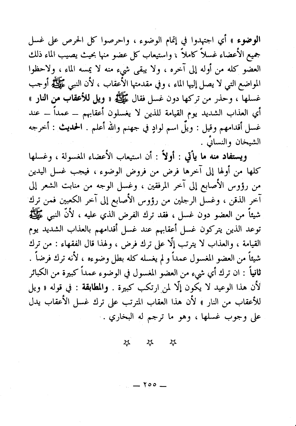ثانياً: ان ترك أي شيء من العضو المغسول في الوضوء عمداً كبيرة من الكبائر لأن هذا الوعيد لا يكون إلاّ لمن ارتكب كبيرة. والمطابقة: في قوله " ويل للأعقاب من النار " لأن هذا العقاب المترتب على ترك غسل الأعقاب يدل على وجوب غسلها، وهو ما ترجم له البخاري.