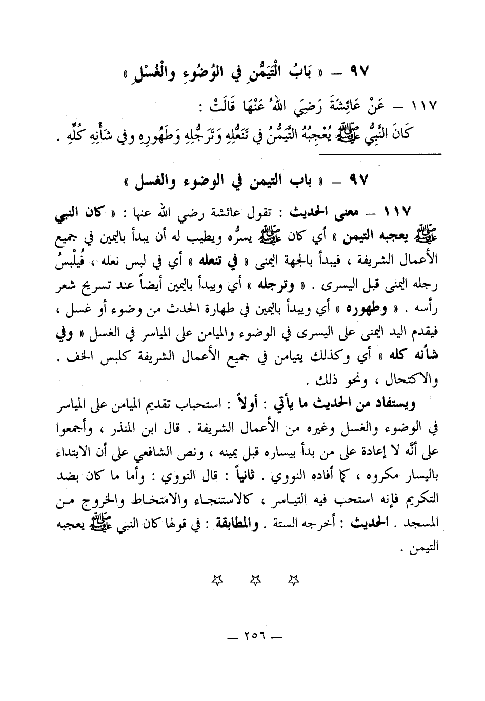 117 - معنى الحديث: تقول عائشة رضي الله عنها: " كان النبي - صلى الله عليه وسلم - يعجبه التيمن " أي كان - صلى الله عليه وسلم -ّ يسرُّه ويطيب له أن يبدأ باليمين في جميع الأعمال الشريفة، فيبدأ بالجهة اليمنى " في تنعله " أي في لبس نعله، فُيلْبسُ رجله اليمنى قبل اليسرى. " وترجله " أي ويبدأ باليمين أيضاً عند تسريح شعر رأسه. " وطهوره " أي ويبدأ باليمين في طهارة الحدث من وضوء أو غسل، فيقدم اليد اليمنى على اليسرى في الوضوء والميامن على المياسر في الغسل " وفي شأنه كله " أي وكذلك يتيامن في جميع الأعمال الشريفة كلبس الخف.