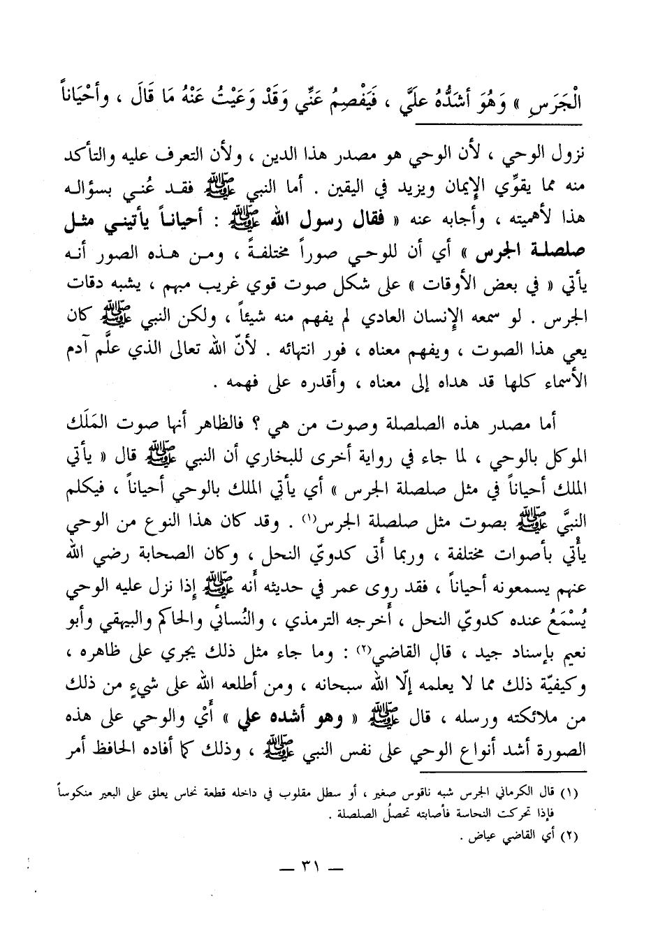 نزول الوحى، لأن الوحي هو مصدر هذا الدين، ولأن التعرف عليه والتأكد منه مما يقوِّي الإيمان ويزيد في اليقين. أما النبي - صلى الله عليه وسلم - فقد عُني بسؤاله هذا لأهميته، وأجابه عنه " فقال رسول الله - صلى الله عليه وسلم -: " أحياناً يأتيني مثل صلصلة الجرس " أي أن للوحي صوراً مختلفةً، ومن هذه الصور أنه يأتي " في بعض الأوقات " على شكل صوت قوي غريب مبهم، يشبه دقات الجرس. لو سمعه الإِنسان العادي لم يفهم منه شيئاً، ولكن النبي - صلى الله عليه وسلم - كان يعي هذا الصوت، ويفهم معناه، فور انتهائه. لأنّ الله تعالى الذي علَّم آدم الأسماء كلها قد هداه إلى معناه، وأقدره على فهمه.
