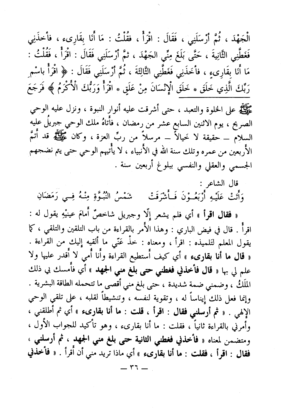الْجَهْدَ، ثُمَّ أرْسَلَنِي، فَقَالَ: اقْرأ، فقُلْت: مَا أنَا بِقَارِىء، فأخذَنِي فَغَطَّنِي الثَّانِيةَ، حَتَّى بَلَغَ مِنِّي الجَهْدَ، ثمَّ أرْسَلَنِي فَقَالَ: اقْرأ، فَقُلْتُ: مَا أنا بقَارِىءٍ، فأخَذَنِي فَغَطَّنِي الثَّالِثَةَ، ثُمَّ أرْسَلَنِي فَقَالَ: (اقْرَأْ بِاسْمِ رَبِّكَ الَّذِي خَلَقَ (1) خَلَقَ الْإِنْسَانَ مِنْ عَلَقٍ (2) اقْرَأْ وَرَبُّكَ الْأَكْرَمُ) فَرَجَعَ