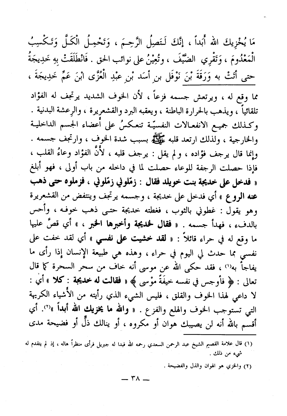 وإنما قال يرجف فؤاده، ولم يقل: يرجف قلبه، لأن الفؤاد وعاءُ القلب، فإذا حصلت الرجفة للوعاء حصلت لما في داخله من باب أولى، فهو أبلغ " فدخل على خديجة بنت خويلد فقال: زمّلوني زمّلوني، فزملوه حتى ذهب عنه الروع " أي فدخل على خديجة، وجسمه يرتجف وينتفض من القشعريرة وهو يقول: غطوني بالثوب، فغطه خديجة حتى ذهب خوفه، وأحس بالدفء، فهدأ جسمه. " فقال لخديجة وأخبرها الخبر، " أي قصَّ عليها ما وقع له في حراء قائلاً: " لقد خشيت على نفسي " أي لقد خفت على نفسي مما حدث لي اليوم في حراء، وهذه هي طبيعة الإنسان إذا رأى ما يفاجأ به (¬1)، فقد حكى الله عنٍ موسى أنه خاف من سحر السحرة كما قال تعالى: (فَأَوْجَسَ فِي نَفْسِهِ خِيفَةً مُوسَى) " فقالت له خديجة: كلا " أي: لا داعي لهذا الخوف والقلق، فليس الشيء الذي رأيته من الأشياء الكريهة التي تستوجب الخوف والهلع والفزع. " والله ما يخزيك الله أبداً " (¬2). أي أقسم بالله أنه لن يصيبك هوان أو مكروه، أو ينالك ذلٌّ أو فضيحة مدى