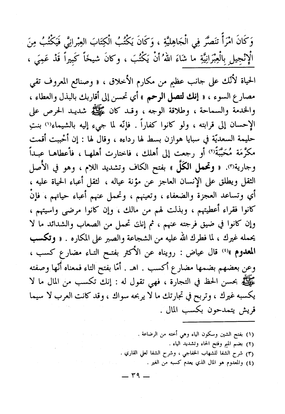 الحياة لأنّك على جانب عظيم من مكارم الأخلاق، " وصنائع المعروف تقي مصارع السوء، " إنك لتصل الرحم " أي تحسن إلى أقاربك بالبذل والعطاء، والخدمة والسماحة، وطلاقة الوجه، وقد كان - صلى الله عليه وسلم - شديد الحرص على الإحسان إلى قرابته، ولو كانوا كفاراً. فإنّه لما جيء إليه بالشيماء (¬1) بنتِ حليمة السعديّة في سبايا هوازن بسط لها رداءه، وقال لها: إن أحْببت أقمت مكرَّمَة مُحَبَبّةَ (¬2) أو رجعت إلى أهلك، فاختارت أهلها، فأعطاها عبداً وجارية (¬3). " وتحمل الكَلَّ " بفتح الكاف وتشديد اللام، وهو في الأصل الثقل ويطلق على الإنسان العاجز عن مؤنة عياله، لثقل أعباء الحياة عليه، أي وتساعد العجزة والضعفاء، وتعينهم، وتحمل عنهم أعباء حياتهم، فإنْ كانوا فقراء أعطيتهم، وبذلت لهم من مالك، وإن كانوا مرضى واسيتهم، وإن كانوا في ضيق فرجته عنهم، ثم إنك تحمل من الصعاب والشدائد ما لا يحمله غيرك، لما فطرك الله عليه من الشجاعة والصبر على المكاره. " وتكسب المعدوم " (¬4) قال عياض: رويناه عن الأكثر بفتح التاء مضارع كسب، وعن بعضهم بضمها مضارع أكسب. اهـ. أمّا بفتح التاء فمعناه أنّها وصفته - صلى الله عليه وسلم - بحسن الحظ في التجارة، فهي تقول له: إنك تكسب من المال ما لا يكسبه غيرك، وتربح في تجارتك ما لا يربحه سواك، وقد كانت العرب لا سيما قريش يتمدحون بكسب المال.
