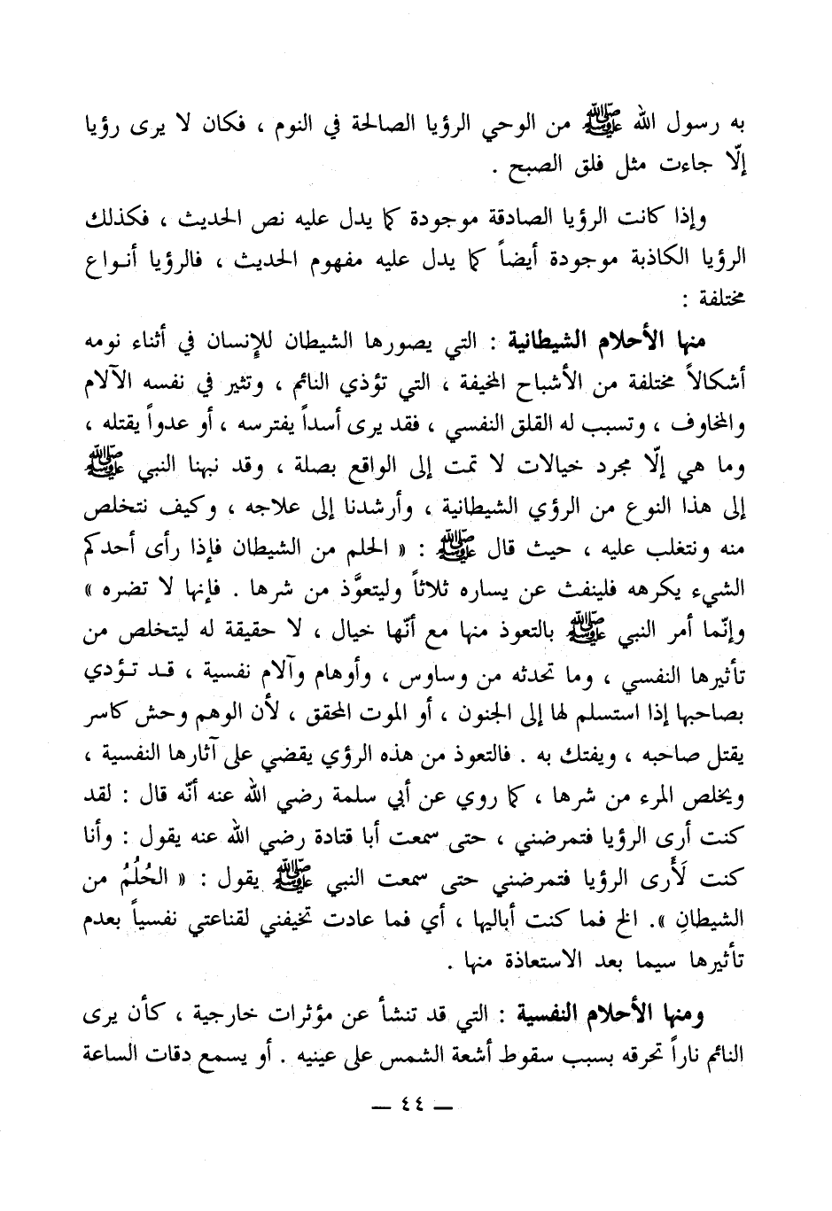 منها الأحلام الشيطانية: التي يصورها الشيطان للإِنسان في أثناء نومه أشكالاً مختلفة من الأشباح المخيفة، التي تؤذي النائم، وتثير في نفسه الآلام والمخاوف، وتسبب له القلق النفسي، فقد يرى أسداً يفترسه، أو عدواً يقتله، وما هي إلاّ مجرد خيالات لا تمت إلى الواقع بصلة، وقد نبهنا النبي - صلى الله عليه وسلم - إلى هذا النوع من الرؤي الشيطانية، وأرشدنا إلى علاجه، وكيف نتخلص منه ونتغلب عليه، حيث قال - صلى الله عليه وسلم -: " الحلم من الشيطان فإذا رأى أحدكم الشيء يكرهه فلينفث عن يساره ثلاثاً وليتعوَّذ من شرها. فإنها لا تضره " وإنّما أمر النبي - صلى الله عليه وسلم - بالتعوذ منها مع أنها خيال، لا حقيقة له ليتخلص من تأثيرها النفسي، وما تحدثه من وساوس، وأوهام وآلام نفسية، قد تؤدي بصاحبها إذا استسلم لها إلى الجنون، أو الموت المحقق، لأن الوهم وحش كاسر يقتل صاحبه، ويفتك به. فالتعوذ من هذه الرؤي يقضي على آثارها النفسية، ويخلص المرء من شرها، كما روي عن أبي سلمة رضي الله عنه أنه قال: لقد كنت أرى الرؤيا فتمرضني، حتى سمعت أبا قتادة رضي الله عنه يقول: وأنا كنت لأرى الرؤيا فتمرضني حتى سمعت النبي - صلى الله عليه وسلم - يقول: " الحُلُمُ من الشيطانِ ". الخ فما كنت أباليها، أي فما عادت تخيفني لقناعتي نفسياً بعدم تأثيرها سيما بعد الاستعاذة منها.