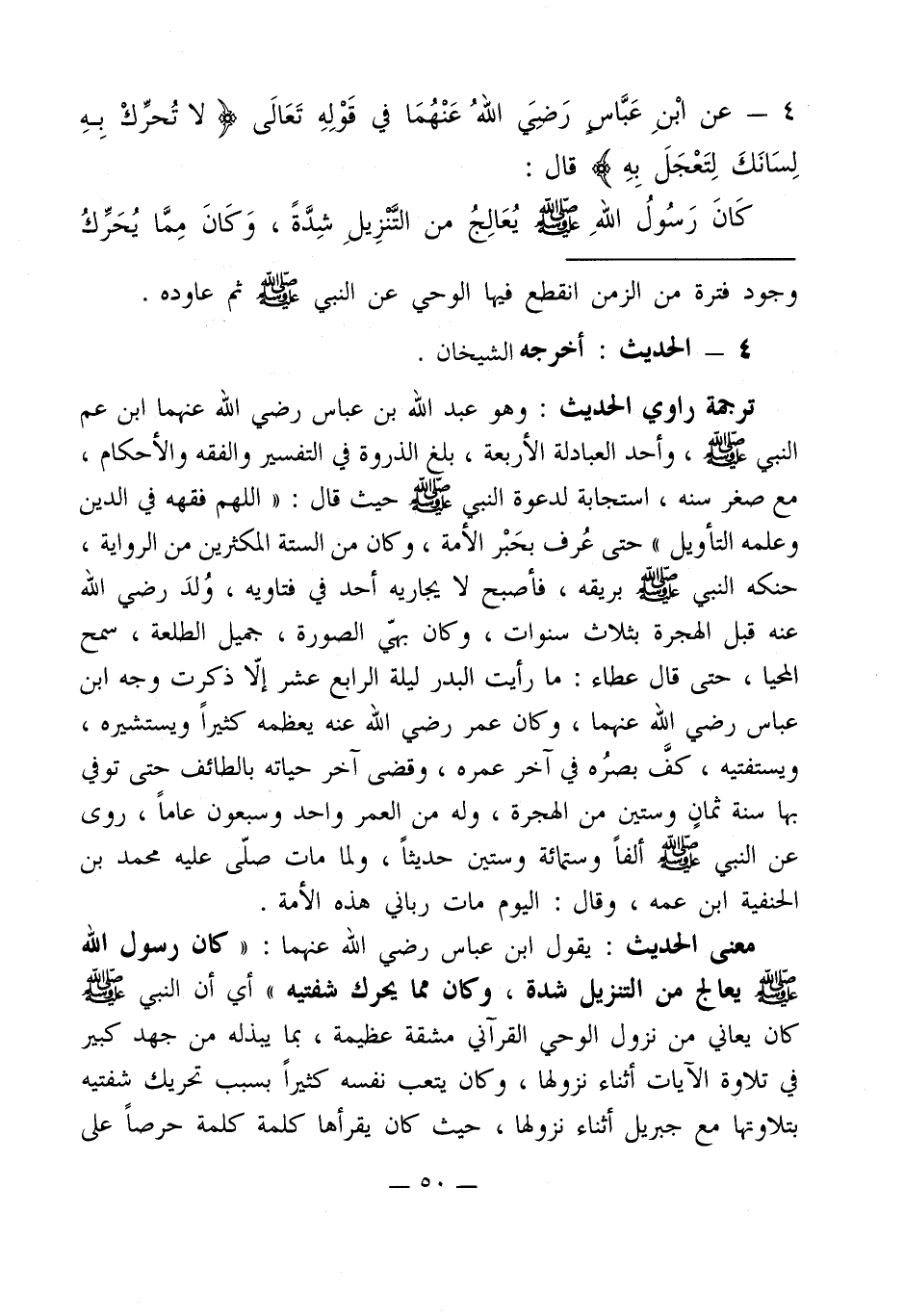 4 - عن ابْنِ عَبَّاس رَضِىَ اللهُ عَنْهُمَا في قَوْلِهِ تَعَالَى (لا تُحرِّكْ بِهِ لِسَانَكَ لِتَعْجَلَ بِهِ) قال: