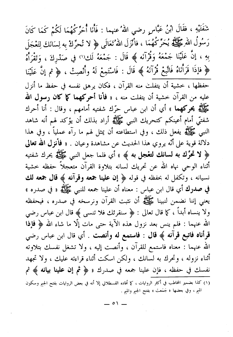 حفظها، خشية أن يتفلت منه القرآن، فكان يرهق نفسه في حفظ ما أنزل عليه من القرآن خشية أن يتفلت منه، " فأنا أحركهما كما كان رسول الله - صلى الله عليه وسلم - يحركهما " أي أن ابن عباس حرّك شفتيه أمامهم، وقال: أنا أحرك شفتيّ أمام أعينكم كتحريك النبي - صلى الله عليه وسلم - أراد بذلك أن يؤكد لهم أنه شاهد النبي - صلى الله عليه وسلم - يفعل ذلك، وفي استطاعته أن يمثل لهم ما رآه عملياً، وفي هذا دلالة قوية على أنه يروي هذا الحديث عن مشاهدة وعيان. " فأنزل الله تعالى (لَا تُحَرِّكْ بِهِ لِسَانَكَ لِتَعْجَلَ بِهِ) " أي فلما جعل النبي - صلى الله عليه وسلم - يحرك شفتيه أثناء الوحي نهاه الله عن تحريك لسانه بتلاوة القرآن متعجلاً حفظه خشية نسيانه، وتكفل له بحفظه في قوله (إِنَّ عَلَيْنَا جَمْعَهُ وَقُرْآَنَهُ) قال جمعه لك في صدرك أي قال ابن عباس: معناه أن علينا جمعه للنبي - صلى الله عليه وسلم - " في صدره " يعنى إننا نضمن لنبينا - صلى الله عليه وسلم - أن نثبت القرآن ونرسخه في صدره، فيحفظه ولا ينساه أبداً، كما قال تعالى: (سَنُقْرِئُكَ فَلَا تَنْسَى) قال ابن عباس رضي الله عنهما: فلم ينس بعد نزول هذه الآية حتى مات إلاّ ما شاء الله (فإذَا قَرَأنَاهُ فَاتَّبعْ قُرْآنَهُ) قال: فاستمع له وأنصت. أي قال ابن عباس رضي الله عنهما: معناه فاستمع للقرآن، وأنصت إليه، ولا تشغل نفسك بتلاوته أثناء نزوله، وتحرك به لسانك، ولكن اسكت أثناء قراءته عليك، ولا تجهد نفسك في حفظه، فإن علينا جمعه في صدرك " (ثُمَّ إِنَّ عَلَيْنَا بَيَانَهُ) ثم
