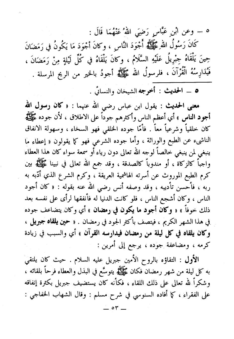 كَانَ رَسُولُ اللهِ - صلى الله عليه وسلم - أجْوَدَ النَّاس، وكانَ أجْوَدَ مَا يَكُونُ في رَمَضَانَ حِينَ يَلْقَاهُ جِبْرِيلُ عَلَيْهِ السَّلَامُ، وكانَ يَلْقَاهُ في كُلِّ لَيْلةٍ مِنْ رَمَضَانَ، فَيُدَارِسُهُ الْقُرْآنَ، فلرسولُ الله - صلى الله عليه وسلم - أجودُ بالخيرِ من الريح المرسلة.