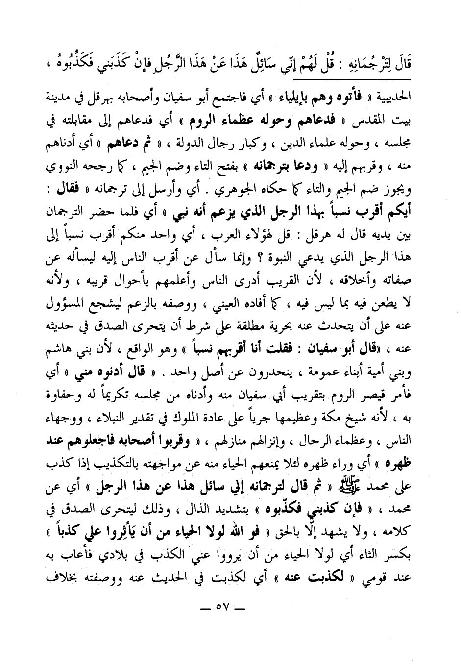 الحديبية " فأتوه وهم بإيلياء " أي فاجتمع أبو سفيان وأصحابه بهرقل في مدينة بيت المقدس " فدعاهم وحوله عظماء الروم " أي فدعاهم إلى مقابلته في مجلسه، وحوله علماء الدين، وكبار رجال الدولة، " ثم دعاهم " أي أدناهم منه، وقربهم إليه " ودعا بترجمانه " بفتح التاء وضم الجيم، كما رجحه النووي ويجوز ضم الجيم والتاء كما حكاه الجوهري. أي وأرسل إلى ترجمانه " فقال: أيكم أقرب نسباً بهذا الرجل الذي يزعم أنه نبي " أي فلما حضر الترجمان بين يديه قال له هرقل: قل لهؤلاء العرب، أي واحد منكم أقرب نسباً إلى هذا الرجل الذي يدعي النبوة؟ وإنما سأل عن أقرب الناس إليه ليسأله عن صفاته وأخلاقه، لأن القريب أدرى الناس وأعلمهم بأحوال قريبه، ولأنه لا يطعن فيه بما ليس فيه، كما أفاده العيني، ووصفه بالزعم ليشجع المسؤول عنه على أن يتحدث عنه بحرية مطلقة على شرط أن يتحرى الصدق في حديثه عنه، "قال أبو سفيان: فقلت أنا أقربهم نسباً" وهو الواقع، لأن بني هاشم وبني أمية أبناء عمومة، ينحدرون عن أصل واحد. "قال أدنوه مني" أي فأمر قيصر الروم بتقريب أبي سفيان منه وأدناه من مجلسه تكريماً له وحفاوة به، لأنه شيخ مكة وعظيمها جرياً على عادة الملوك في تقدير النبلاء، ووجهاء الناس، وعظماء الرجال، وإنزالهم منازلهم، " وقربوا أصحابه فاجعلوهم عند ظهره " أي وراء ظهره لئلا يمنعهم الحياء منه عن مواجهته بالتكذيب إذا كذب على محمد - صلى الله عليه وسلم - " ثم قال لترجمانه إني سائل هذا عن هذا الرجل " أي عن محمد، " فإن كذبني فكذّبوه " بتشديد الذال، وذلك ليتحرى الصدق في كلامه، ولا يشهد إلّا بالحق " فوالله لولا الحياء من أن يَأثِروا علي كذباً " بكسر الثاء أي لولا الحياء من أن يرووا عني الكذب في بلادي فأعاب به عند قومي " لكذبت عنه " أي لكذبت في الحديث عنه ووصفته بخلاف