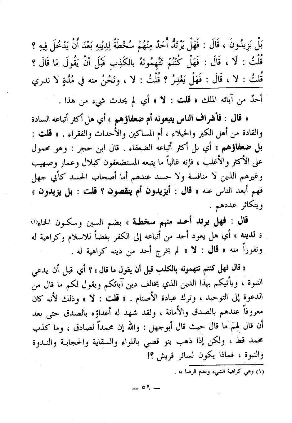 بَلْ يَزِيدُونَ، قَالَ: فَهَلْ يَرْتَدُّ أحدْ مِنْهُمْ سُخْطَةً لِدِينهِ بَعْدَ أن يَدْخُلَ فِيهِ؟ قُلْتُ: لَا، قَالَ: فَهَلْ كُنْتُمْ تَتَّهِمُونَهُ بالكَذِبِ قَبْلَ أنْ يَقُولَ مَا قَالَ؟ قُلتُ: لا، قَالَ: فَهَلْ يَغْدِرُ؟ قُلْتُ: لا، ونَحْنُ منه في مُدَّةٍ لا ندري