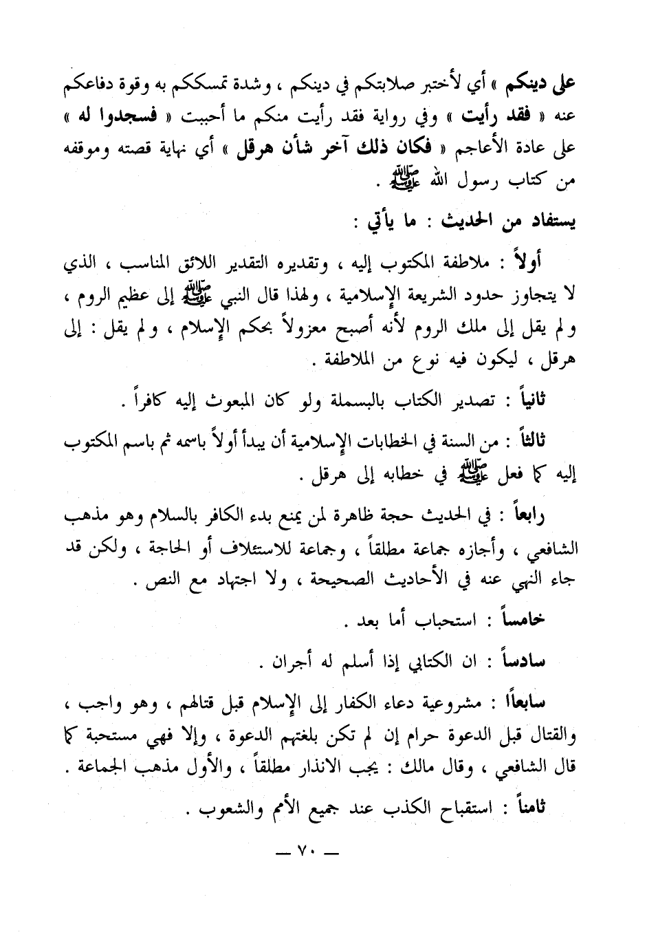أولاً: ملاطفة المكتوب إليه، وتقديره التقدير اللائق المناسب، الذي لا يتجاوز حدود الشريعة الإِسلامية، ولهذا قال النبي - صلى الله عليه وسلم - إلى عظيم الروم، ولم يقل إلى ملك الروم لأنه أصبح معزولاً بحكم الإِسلام، ولم يقل: إلى هرقل، ليكون فيه نوع من الملاطفة.