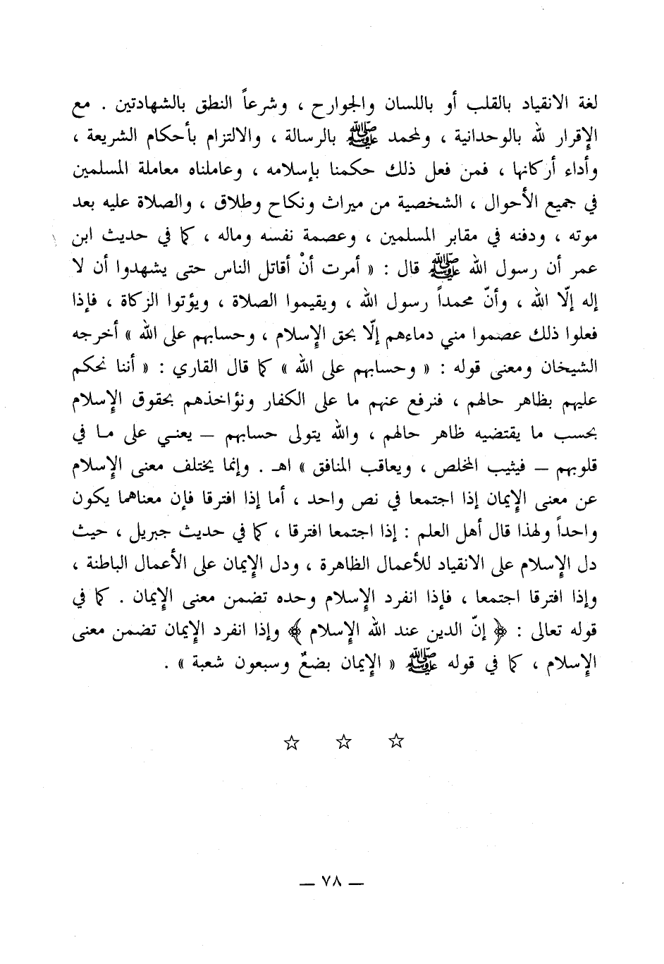 لغة الانقياد بالقلب أو باللسان والجوارح، وشرعاً النطق بالشهادتين. مع الإقرار لله بالوحدانية، ولمحمد - صلى الله عليه وسلم - بالرسالة، والالتزام بأحكام الشريعة، وَأداء أركانها، فمن فعل ذلك حكمنا بإسلامه، وعاملناه معاملة المسلمين في جميع الأحوال، الشخصية من ميراث ونكاح وطلاق، والصلاة عليه بعد موته، ودفنه في مقابر المسلمين، وعصمة نفسه وماله، في حديث ابن عمر أن رسول الله - صلى الله عليه وسلم - قال: " أمرت أنْ أقاتل الناس حتى يشهدوا أن لا إله إلاّ الله، وأنّ محمداً رسول الله، ويقيموا الصلاة، ويؤتوا الزكاة، فإذا فعلوا ذلك عصموا مني دماءهم إلاّ بحق الإِسلام، وحسابهم على الله " أخرجه الشيخان ومعنى قوله: " وحسابهم على الله " كما قال القاري: " أننا نحكم عليهم بظاهر حالهم، فنرفع عنهم ما على الكفار ونؤاخذهم بحقوق الإِسلام بحسب ما يقتضيه ظاهر حالهم، والله يتولى حسابهم -يعني على ما في قلوبهم- فيثيب المخلص، ويعاقب المنافق " اهـ. وإنما يختلف معنى الإِسلام عن معنى الإِيمان إذا اجتمعا في نص واحد، أما إذا افترقا فإن معناهما يكون واحداً ولهذا قال أهل العلم: إذا اجتمعا افترقا، كما في حديث جبريل، حيث دل الإِسلام على الانقياد للأعمال الظاهرة، ودل الإِيمان على الأعمال الباطنة، وإذا افترقا اجتمعا، فإذا انفرد الإِسلام وحده تضمن معنى الإِيمان. كما في قوله تعالى: (إِنَّ الدِّينَ عِنْدَ اللَّهِ الْإِسْلَامُ) وإذا انفرد الإِيمان تضمن معنى الإِسلام، كما في قوله - صلى الله عليه وسلم - " الإِيمان بضعٌ وسبعون شعبة ".