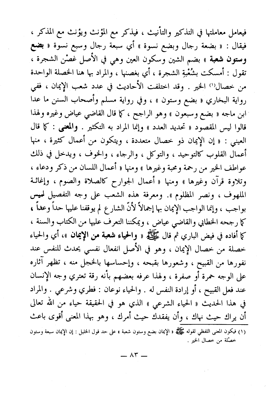 (¬1) فيكون المعنى اللفظي لقوله - صلى الله عليه وسلم - " الإيمان بضع وستون شعبة " على حد قول الخليل: إن الإيمان سبعة وستون خصْلة من خصال الخير.
