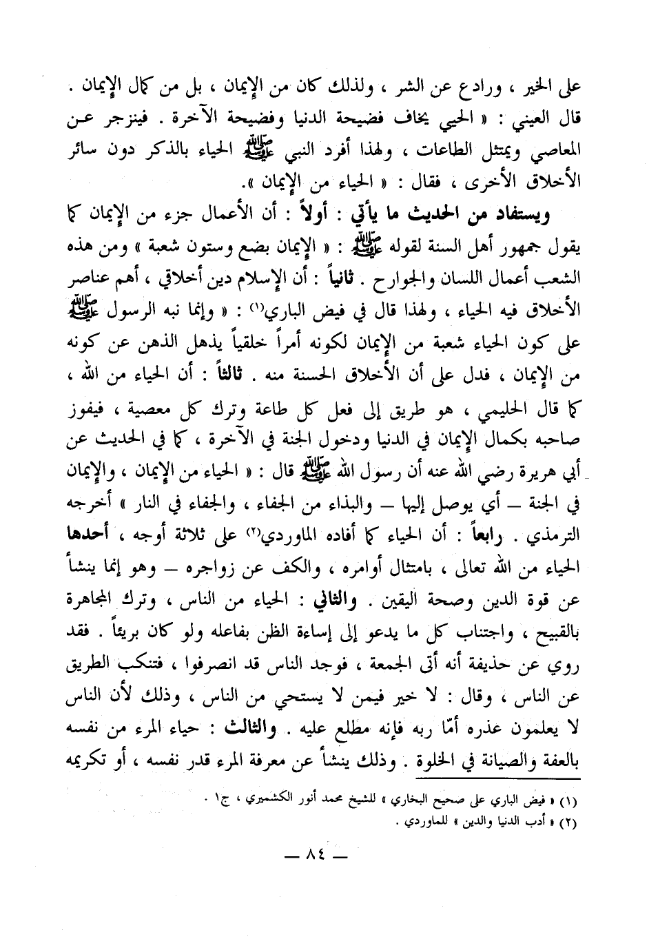 ويستفاد من الحديث ما يأتي: أولاً: أن الأعمال جزء من الإيمان كما يقول جمهور أهل السنة لقوله - صلى الله عليه وسلم -: " الإيمان بضع وستون شعبة " ومن هذه الشعب أعمال اللسان والجوارح. ثانياً: أن الإِسلام دين أخلاقي، أهم عناصر الأخلاق فيه الحياء، ولهذا قال في فيض الباري (¬1): " وإنما نبه الرسول - صلى الله عليه وسلم - على كون الحياء شعبة من الإيمان لكونه أمراً خلقياً يذهل الذهن عن كونه من الإِيمان، فدل على أن الأخلاق الحسنة منه. ثالثاً: أن الحياء من الله، كما قال الحليمي، هو طريق إلى فعل كل طاعة وترك كل معصية، فيفوز صاحبه بكمال الإِيمان في الدنيا ودخول الجنة في الآخرة، كما في الحديث عن أبي هريرة رضي الله عنه أن رسول الله - صلى الله عليه وسلم - قال: " الحياء من الإيمان، والإِيمان في الجنة -أي يوصل إليها- والبذاء من الجفاء، والجفاء في النار " أخرجه الترمذي. رابعاً: أن الحياء كما أفاده الماوردي (¬2) على ثلاثة أوجه، أحدها الحياء من الله تعالى، بامتثال أوامره، والكف عن زواجره - وهو إنما ينشأ عن قوة الدين وصحة اليقين. والثاني: الحياء من الناس، وترك المجاهرة بالقبيح، واجتناب كل ما يدعو إلى إساءة الظن بفاعله ولو كان بريئاً. فقد روي عن حذيفة أنه أتى الجمعة، فوجد الناس قد انصرفوا، فتنكب الطريق عن الناس، وقال: لا خير فيمن لا يستحي من الناس، وذلك لأن الناس لا يعلمون عذره أمّا ربه فإنه مطلع عليه. والثالث: حياء المرء من نفسه بالعفة والصيانة في الخلوة. وذلك ينشأ عن معرفة المرء قدر نفسه، أو تكريمه