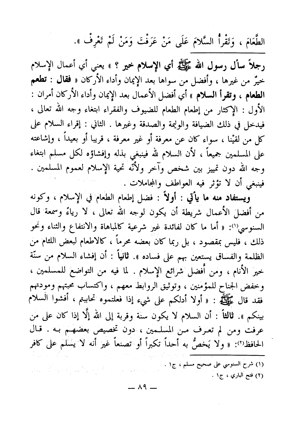رجلاً سأل رسول الله - صلى الله عليه وسلم - أي الإِسلام خير؟ " يعني أي أعمال الإِسلام خيرٌ من غيرها، وأفضل من سواها بعد الإِيمان وأداء الأركان " فقال: تطعم الطعام، وتقرأ السلام " أي أفضل الأعمال بعد الإيمان وأداء الأركان أمران: الأول: الإكثار من إطعام الطعام للضيوف والفقراء ابتغاء وجه الله تعالى، فيدخل في ذلك الضيافة والوليمة والصدقة وغيرها. الثاني: إقراء السلام على كل من لقيْنا، سواء كان عن معرفة أو غير معرفة، قريباً أو بعيداً، وإشاعته على المسلمين جميعاً، لأن السلام لله فينبغي بذله وإفشاؤه لكل مسلم ابتغاء وجه الله دون تمييز بين شخص وآخر ولأنّه تحية الإِسلام لعموم المسلمين.