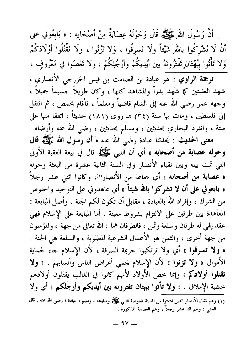 معنى الحديث: يحدثنا عبادة رضي الله عنه " أن رسول الله - صلى الله عليه وسلم - قال وحوله عصابة من أصحابه " أي أن النبي - صلى الله عليه وسلم - قال في بيعة العقبة الأولى التي تمت بينه وبين نقباء الأنصار وفي السنة الثانية عشرة من البعثة وحوله " عصابة من أصحابه " أي جماعة من الأنصار (¬1)، وكانوا اثني عشر رجلاً "بايعوني على أن لا تشركوا بالله شيئاً" أي عاهدوني على التوحيد والخلوص من الشرك، وإفراد الله بالعبادة، مقابل أن تكون لكم الجنة. وأصل المبايعة: المعاهدة بين طرفين على الالتزام بشروط معينة. أما المبايعة على الإِسلام فهي عقد إلهي له طرفان وسلعة وثمن، فالطرفان هما: الله تعالى من جهة، والمؤمنون من جهة أخرى، والثمن هو الأعمال الشرعية المطلوبة، والسلعة هي الجنة.
