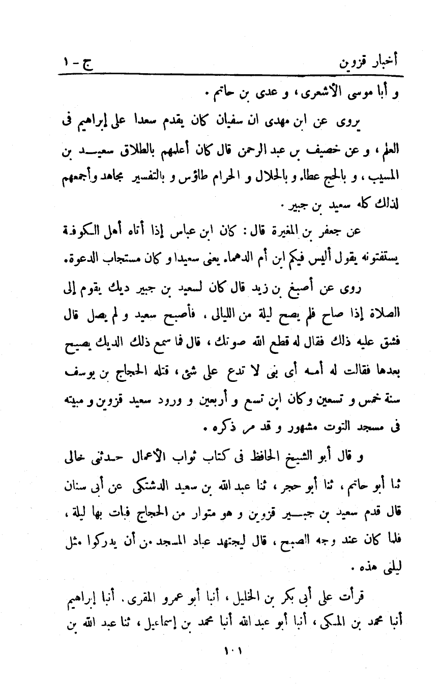 وقال أبو الشيخ الحافظ في كتاب ثواب الأعمال حدثني خالي ثنا أبو حاتم ثنا أبو حجر ثنا عَبْد اللَّه بْن سعيد الدشتكي عن أبي سنان قَالَ قدم سعيد بْن جبير قزوين وهو متوار من الحجاج فبات بها ليلة فلما كان عند وجه الصبح قَالَ ليجتهد عباد المسجد من أن يدركوا مثل ليلتي هذه.