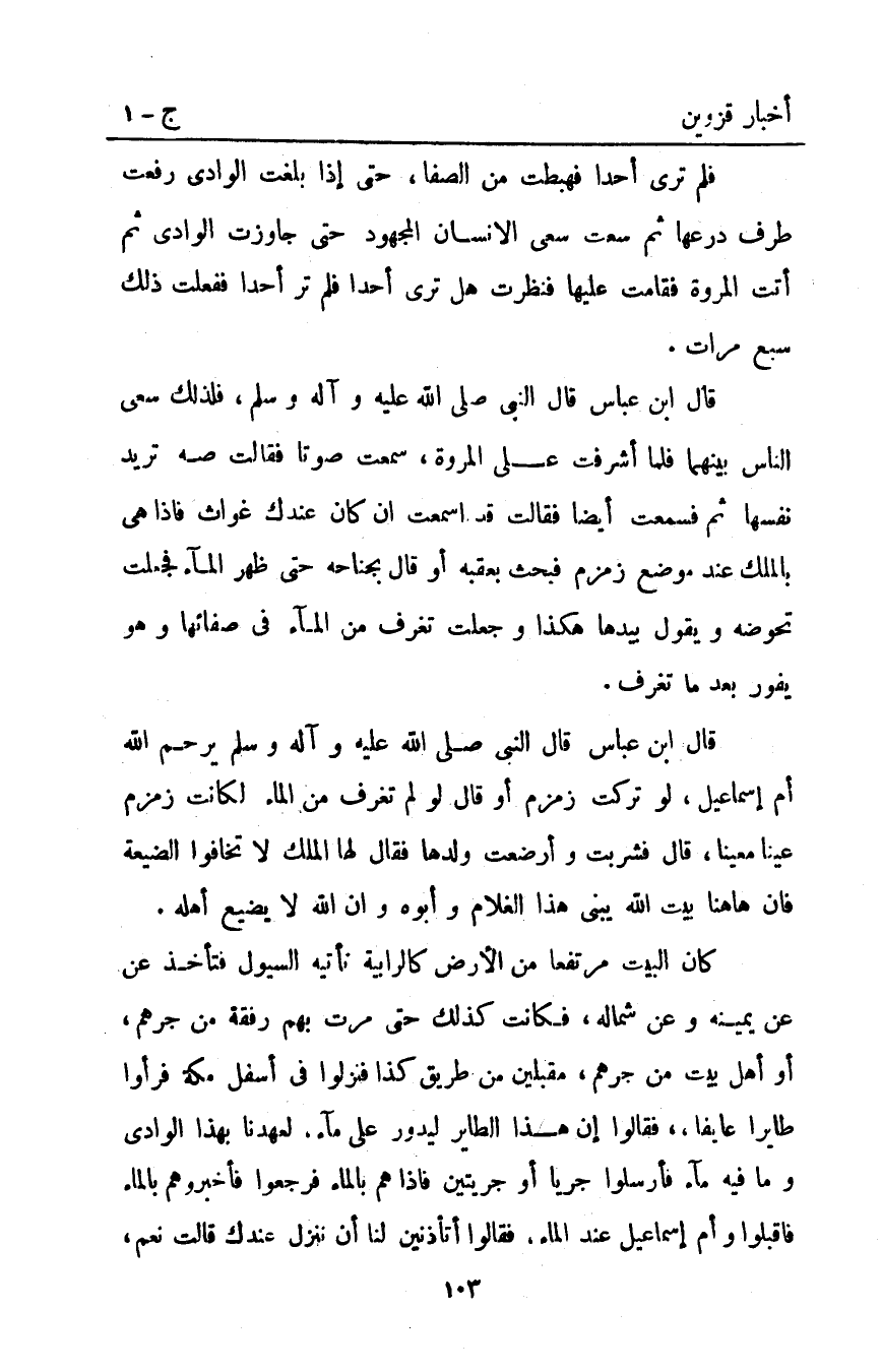 قَالَ ابْنُ عَبَّاسٍ: قَالَ النَّبِيُّ صَلَّى اللَّهُ عليه واله وسلم: "يَرْحَمُ اللَّهُ أُمَّ إِسْمَاعِيلَ لَوْ تَرَكَتْ زَمْزَمَ" أَوْ قَالَ: "لَوْ لَمْ تَغْرِفْ مِنَ الْمَاءِ لَكَانَتْ زَمْزَمُ عَيْنًا مَعِينًا" قَالَ: فَشَرِبَتْ وَأَرْضَعَتْ وَلَدَهَا فَقَالَ لَهَا الْمَلَكُ: لا تَخَافُوا الضَّيْعَةَ فَإِنَّ هَاهُنَا بَيْتَ اللَّهِ يَبْنِي هَذَا الْغُلامُ وَأَبُوهُ وَإِنَّ اللَّهَ لا يُضِيعُ أَهْلَهُ.