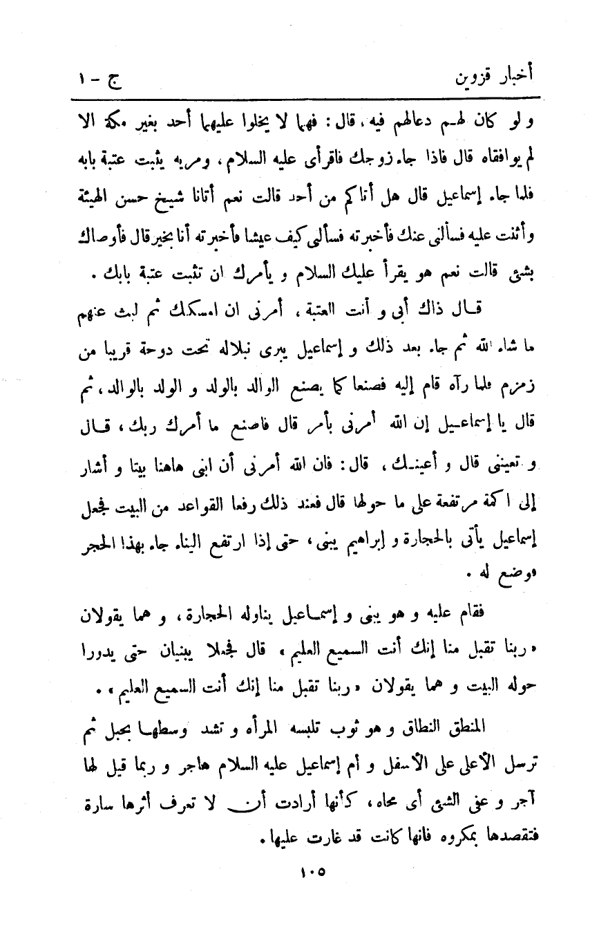 فَقَامَ عَلَيْهِ وَهُوَ يَبْنِي وَإِسْمَاعِيلُ يُنَاوِلُهُ الْحِجَارَةَ وَهُمَا يَقُولانِ: {رَبَّنَا تَقَبَّلْ مِنَّا إِنَّكَ أَنْتَ السَّمِيعُ الْعَلِيمُ} قَالَ: فَجَعَلا يَبْنِيَانِ حَتَّى يَدُورَا حوله الْبَيْتِ وَهُمَا يَقُولانِ: {رَبَّنَا تَقَبَّلْ مِنَّا إِنَّكَ أَنْتَ السَّمِيعُ الْعَلِيمُ} .