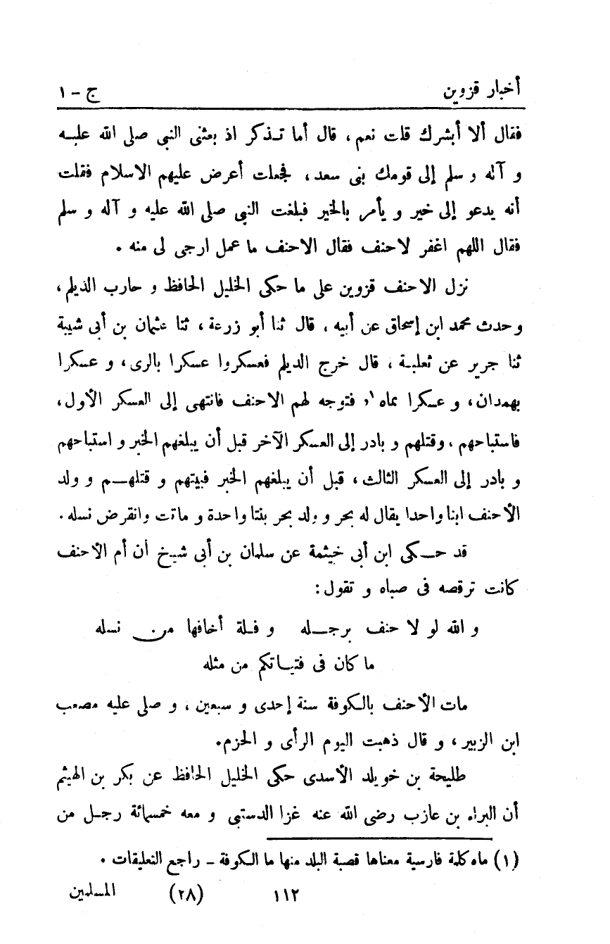 نزل الأحنف قزوين على ما حكى الخليل الحافظ وحارب الديلم وحدث مُحَمَّد ابن إسحاق عن أبيه قَالَ: ثنا أبو زرعة ثنا عثمان بْن أبي شيبة ثنا جرير عن ثعلبة قَالَ: خرج الديلم فعسكروا عسكرا بالري وعسكرا بهمدان وعسكرا بماه1 فتوجه لهم الأحنف فانتهى إلى العسكر الأول فاستباحهم وقتلهم وبادر إلى العسكر الآخر قبل أن يبلغهم الخبر واستباحهم وبادر إلى العسكر الثالث قبل أن يبلغهم الخبر فبيتهم وقتلهم وولد الأحنف ابنا واحدا يقال له بحر وولد بحر بنتا واحدة وماتت وانقرض نسله.
