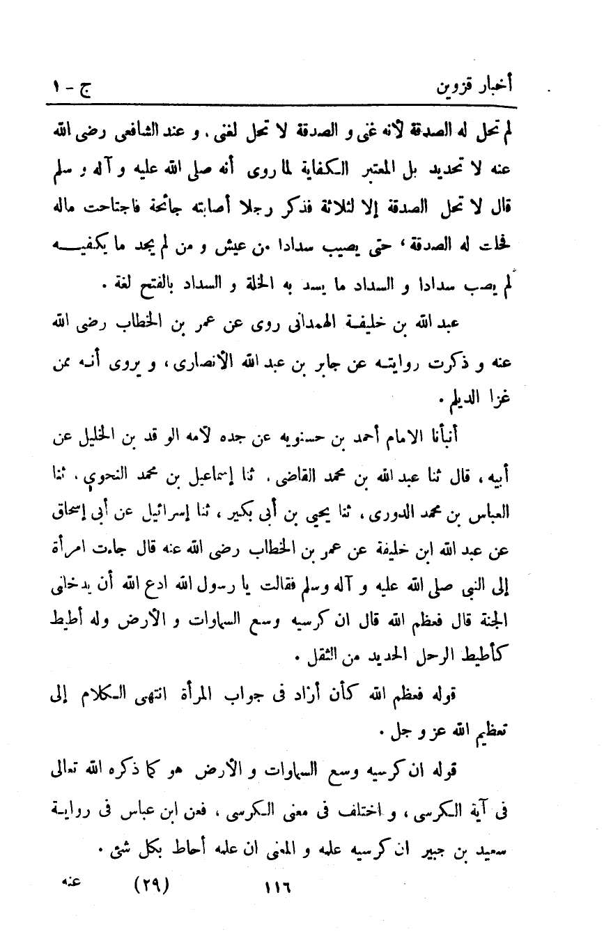أَنْبَأَنَا الإِمَامُ أَحْمَدُ بْنُ حَسْنَوَيْهِ عَنْ جَدِّهِ لأُمِّهِ الْوَاقِدِ بْنِ الْخَلِيلِ عَنْ أَبِيهِ قَالَ ثَنَا عَبْدُ اللَّهِ بْنُ مُحَمَّدٍ الْقَاضِي ثَنَا إِسْمَاعِيلُ بْنُ مُحَمَّدٍ النَّحْوِيُّ ثَنَا الْعَبَّاسُ بْنُ مُحَمَّدٍ الدُّورِيُّ ثَنَا يَحْيَى بْنُ أَبِي بُكَيْرٍ ثنا إسرائيل عن أبي إسحاق عن عبد الله ابن خَلِيفَةَ عَنْ عُمَرَ بْنِ الْخَطَّابِ رَضِيَ اللَّهُ عَنْهُ قَالَ: جَاءَتِ امْرَأَةٌ إِلَى النَّبِيِّ صَلَّى اللَّهُ عليه واله وَسَلَّمَ فَقَالَتْ: يَا رَسُولَ اللَّهِ ادْعُ اللَّهَ أَنْ يُدْخِلُنِي الْجَنَّةَ, قَالَ: "فَعَظَّمَ اللَّهَ قَالَ: إِنَّ كُرْسِيَّهُ وَسِعَ السَّمَوَاتِ وَالأَرْضَ وَلَهُ أَطِيطٌ كَأَطِيطِ الرَّحْلِ الْحَدِيدِ مِنَ الثِّقَلِ".