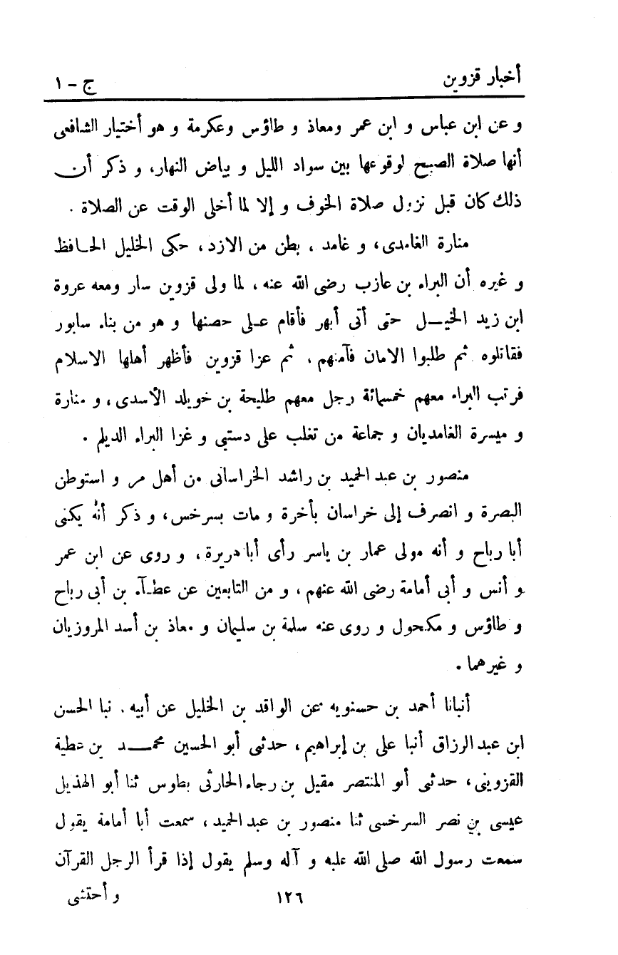 أَنْبَأَنَا أَحْمَدُ بْنُ حَسْنَوَيْهِ عَنِ الْوَاقِدِ بْنِ الْخَلِيلِ عن أبيه نبأ الحسن ابن عَبْدِ الرَّزَّاقِ أَنْبَأَ عَلِيُّ بْنُ إِبْرَاهِيمَ حَدَّثَنِي أَبُو الْحُسَيْنِ مُحَمَّدُ بْنُ عَطِيَّةَ الْقَزْوِينِيُّ حَدَّثَنِي أَبُو المنتصر مقيل بن رجاء الحارثي بطوس ثَنَا أَبُو الْهُذَيْلِ عِيسَى بْنُ نَصْرٍ السَّرْخَسِيُّ ثَنَا مَنْصُورُ بْنُ عَبْدِ الْحَمِيدِ سَمِعْتُ أَبَا أُمَامَةَ يَقُولُ سَمِعْتُ رَسُولَ اللَّهِ صَلَّى اللَّهُ عَلَيْهِ وَآلِهِ وَسَلَّمَ يَقُولُ: "إِذَا قَرَأَ الرَّجُلُ الْقُرْآنَ