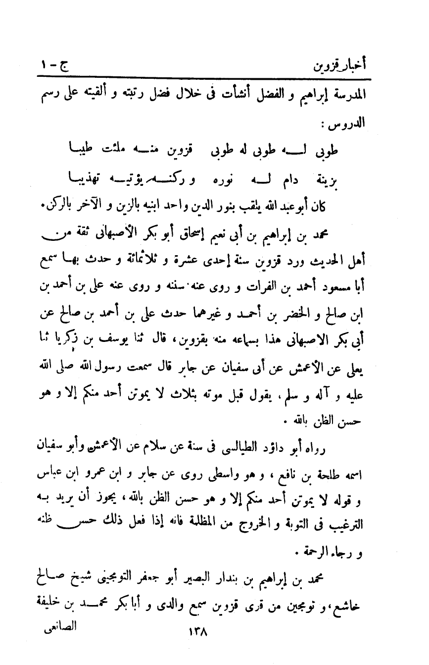 مُحَمَّدِ بْنِ إِبْرَاهِيمَ بْنِ أَبِي نعيم إسحاق أبو بكر الأصبهاني ثقة من أهل الحديث ورد قزوين سنة إحدى عشرة وثلاثمائة وحدث بها سمع أبا مسعود أَحْمَد بْن الفرات وروى عنه سننه وروى عنه علي بْن أَحْمَدَ بْن ابن صالح والخضر بْن أَحْمَدَ وغيرهما حدث علي بْن أَحْمَدَ بْن صالح عن أبي بكر الأصبهاني هذا بسماعه منه بقزوين قَالَ ثَنَا يُوسُفُ بْنُ زَكَرِيَّا ثَنَا يَعْلَى عَنِ الأَعْمَشِ عَنْ أَبِي سُفْيَانَ عَنْ جَابِرٍ قَالَ سَمِعْتُ رَسُولَ اللَّهِ صَلَّى اللَّهُ عَلَيْهِ وَآلِهِ وَسَلَّمَ يَقُولُ قَبْلَ مَوْتِهِ بِثَلاثٍ: "لا يَمُوتُنَّ أَحَدٌ مِنْكُمْ إِلا وَهُوَ حَسَنُ الظَّنِّ بِاللَّهِ".