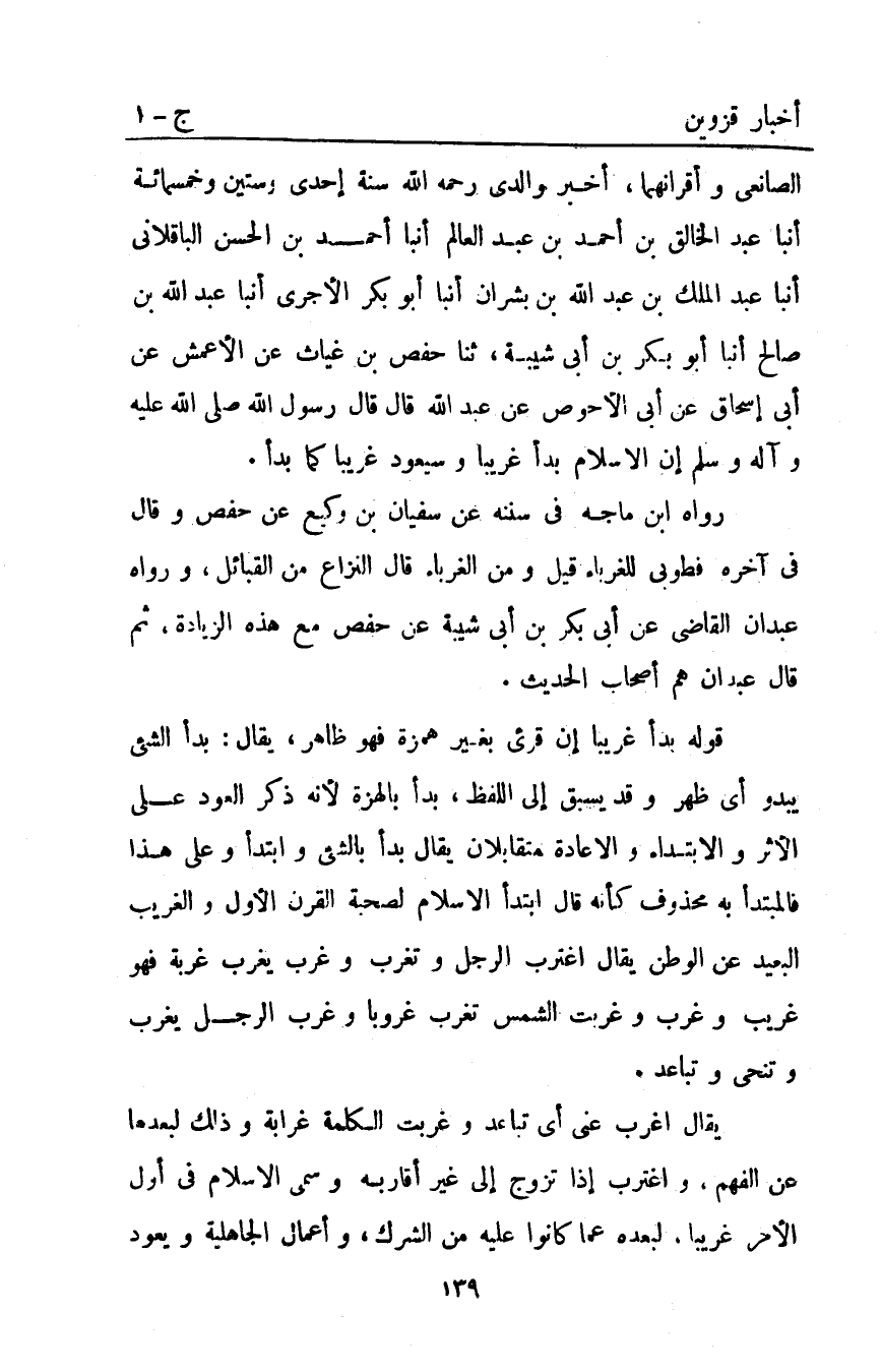 الصَّانِعِيَّ وَأَقْرَانَهُمَا أَخْبَرَ وَالِدِي رَحِمَهُ الله سنة إحدى وستين وخمسمائة أَنْبَأَ عَبْدُ الْخَالِقِ بْنُ أَحْمَدَ بْنِ عَبْدِ الْعَالِمِ أَنْبَأَ أَحْمَدُ بْنُ الْحَسَنِ الْبَاقِلانِيُّ أَنْبَأَ عَبْدُ الْمَلِكِ بْنُ عَبْدِ اللَّهِ بْنِ بُشْرَانَ أَنْبَأَ أَبُو بَكْرٍ الأَجُرِّيُّ أَنْبَأَ عَبْدُ اللَّهِ بْنُ صَالِحٍ أَنْبَأَ أَبُو بَكْرِ بْنُ أَبِي شَيْبَةَ ثَنَا حَفْصُ بْنُ غِيَاثٍ عَنِ الأَعْمَشِ عَنْ أَبِي إِسْحَاقَ عَنْ أَبِي الأَحْوَصِ عَنْ عَبْدِ اللَّهِ قَالَ: قَالَ رَسُولُ اللَّهِ صَلَّى اللَّهُ عَلَيْهِ وَآلِهِ وَسَلَّمَ: "إِنَّ الإِسْلامَ بَدَأَ غَرِيبًا وَسَيَعُودُ غَرِيبًا كَمَا بَدَأَ".