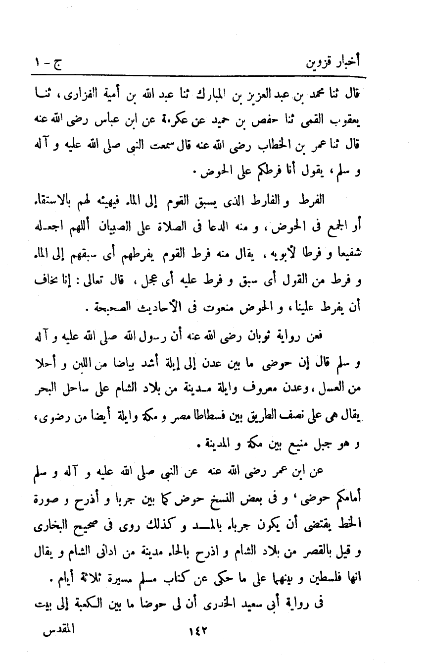 قَالَ ثَنَا مُحَمَّدُ بْنُ عَبْدِ الْعَزِيزِ بْنُ الْمُبَارَكِ ثَنَا عَبْدُ اللَّهِ بْنُ أُمَيَّةَ الْفَزَارِيُّ ثَنَا يَعْقُوبُ الْقُمِّيُّ ثَنَا حَفْصُ بْنُ حُمَيْدٍ عَنْ عِكْرِمَةَ عَنِ ابْنِ عَبَّاسٍ رَضِيَ اللَّهُ عَنْهُ قَالَ ثَنَا عُمَرُ بْنُ الْخَطَّابِ رَضِيَ اللَّهُ عَنْهُ قَالَ: سَمِعْتُ النَّبِيَّ صَلَّى اللَّهُ عَلَيْهِ وَآلِهِ وَسَلَّمَ يَقُولُ: "أَنَّا فَرَطُكُمْ عَلَى الْحَوْضِ".
