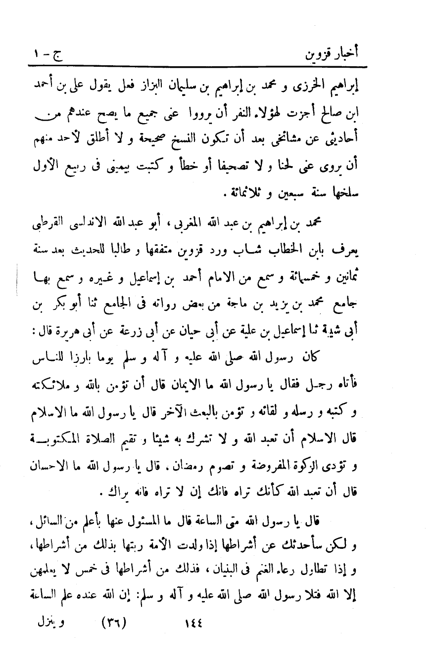 مُحَمَّد بْن إبراهيم بْن عَبْد اللَّه المغربي أبو عَبْد اللَّه الأندلسي القرطبي يعرف بابن الخطاب شاب ورد قزوين متفقها وطالبا للحديث بعد سنة ثمانين وخمسمائة وسمع من الإمام أَحْمَد بْن إسماعيل وغيره وسمع بها جامع مُحَمَّد بْن يزيد بْن ماجة من بعض رواته في الجامع ثَنَا أَبُو بَكْرِ بْنُ أَبِي شَيْبَةَ ثَنَا إِسْمَاعِيلُ بْنُ عُلَيَّةَ عَنْ أَبِي حَيَّانَ عَنْ أَبِي زُرْعَةَ عَنْ أَبِي هُرَيْرَةَ قَالَ: كَانَ رَسُولُ اللَّهِ صَلَّى اللَّهُ عليه واله وَسَلَّمَ يَوْمًا بَارِزًا لِلنَّاسِ فَأَتَاهُ رَجُلٌ فَقَالَ: يَا رَسُولَ اللَّهِ صَلَّى اللَّهُ عَلَيْهِ وَآلِهِ وَسَلَّمَ مَا الإِيمَانُ؟ قَالَ: "أَنْ تُؤْمِنَ بِاللَّهِ وَمَلائِكَتِهِ وَكُتُبِهِ وَرُسُلِهِ وَلِقَائِهِ وَتُؤْمِنَ بِالْبَعْثِ الآخَرِ" قَالَ: يَا رَسُولَ اللَّهِ مَا الإِسْلامُ؟ قَالَ: "الإِسْلامُ أَنْ تَعْبُدَ اللَّهَ لا تُشْرِكُ بِهِ شَيْئًا وَتُقِيمُ الصَّلاةَ المكتوبة وتؤدي الزكوة الْمَفْرُوضَةَ وَتَصُومُ رَمَضَانَ" قَالَ: يَا رَسُولَ اللَّهِ مَا الإِحْسَانُ؟ قَالَ: "أَنْ تَعْبُدَ اللَّهَ كَأَنَّكَ تَرَاهُ فَإِنَّكَ إِنْ لا تَرَاهُ فَإِنَّهُ يَرَاكَ".
