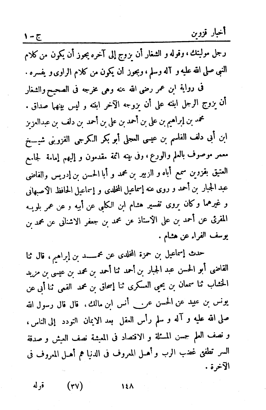 حَدَّثَ إِسْمَاعِيلُ بْنُ حَمْزَةَ الْمَخْلَدِيُّ عَنْ مُحَمَّدِ بْنِ إِبْرَاهِيمَ قَالَ ثَنَا الْقَاضِي أَبُو الْحَسَنِ عَبْدُ الْجَبَّارِ بْنُ أَحْمَدَ ثَنَا أَحْمَدُ بْنُ مُحَمَّدِ بْنِ عِيسَى بْنِ مَزِيدٍ الْخَشَّابُ ثَنَا سَمْعَانُ بْنُ يَحْيَى الْعَسْكَرِيُّ ثَنَا إِسْحَاقُ بْنُ مُحَمَّدٍ الْقُمِّيُّ ثَنَا أَبِي عَنْ يُونُسَ بْنِ عُبَيْدٍ عن الحسن عن أنس ابن مَالِكٍ قَالَ قَالَ رَسُولُ اللَّهِ صَلَّى اللَّهُ عَلَيْهِ وَآلِهِ وَسَلَّمَ: "رَأْسُ الْعَقْلِ بَعْدَ الإِيمَانِ التَّوَدُّدُ إِلَى النَّاسِ وَنِصْفُ الْعِلْمِ حُسْنُ المسئلة وَالاقْتِصَادُ فِي الْمَعِيشَةِ نِصْفُ الْعَيْشِ وصدقة السر تطفىء غَضَبَ الرَّبِّ وَأَهْلُ الْمَعْرُوفِ فِي الدُّنْيَا هُمْ أَهْلُ الْمَعْرُوفِ فِي الآخرة