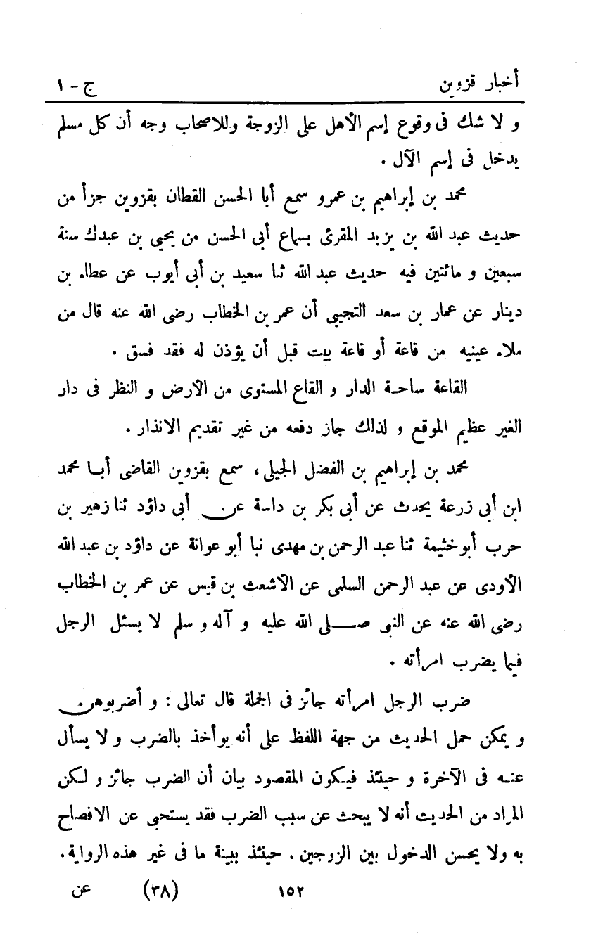 مُحَمَّد بْن إبراهيم بْن الفضل الجيلي سمع بقزوين القاضي أبا مُحَمَّد ابن أبي زرعة يُحَدِّثُ عَنْ أَبِي بَكْرِ بن داسة عن أبي داؤد ثَنَا زُهَيْرُ بْنُ حَرْبٍ أَبُو خَثْيَمَةَ ثَنَا عَبْدُ الرَّحْمَنِ بْنُ مَهْدِيٍّ نَبَّأَ أَبُو عَوَانَةَ عَنْ داؤد بْنِ عَبْدِ اللَّهِ الأَوْدِيِّ عَنْ عَبْدِ الرَّحْمَنِ السُّلَمِيِّ عَنِ الأَشْعَثِ بْنِ قَيْسٍ عَنْ عُمَرَ بْنِ الْخَطَّابِ رَضِيَ اللَّهُ عَنْهُ عَنِ النَّبِيَّ صَلَّى اللَّهُ عَلَيْهِ وَآلِهِ وَسَلَّمَ: "لا يُسْئَلُ الرَّجُلُ فِيمَا يَضْرِبُ امْرَأَتَهُ".