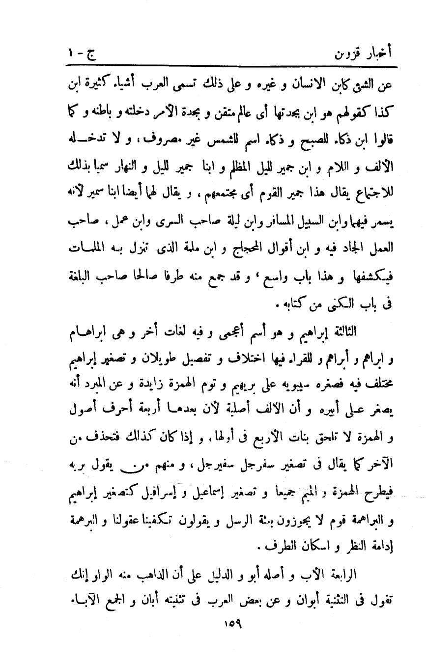 عن الشيء كابن الإنسان وغيره وعلى ذلك تسمى العرب أشياء كثيرة ابن كذا كقولهم هو ابن بجدتها أي عالم متقن وبجدة الأمر دخلته وباطنه وكما قالوا ابن ذكاء للصبح وذكاء اسم للشمس غير مصروف ولا تدخله الألف واللام وابن جمير لليل المظلم وابنا جمير لليل والنهار سميا بذلك للاجتماع يقال هذا جمير القوم أي مجتمعهم ويقال لهما أيضا ابنا سمير لأنه يسمر فيهما وابن السبيل المسافر وابن ليلة صاحب السري وابن عمل صاحب العمل الجاد فيه وابن أقوال المحجاج وابن ملمة الذي تنزل به الملمات فيكشفها وهذا باب واسع وقد جمع منه طرفا صالحا صاحب البلغة في باب الكنى من كتابه.