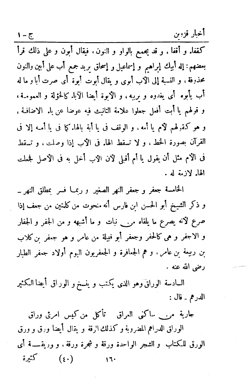 الخامسة: جعفر وجعفر النهر الصغير وربما فسر بمطلق النهر وذكر الشيخ أبو الحسن ابن فارس أنه منحوت من كلمتين من جعف إذا صرع لأنه يصرع ما يلقاه من نبات وما أشبهه ومن الجفر والجفار والأجفر وهي كالحفر وجعفر أبو قبيلة من عامر وهو جعفر بْن كلاب بْن ربيعة بْن عامر وهم الجعافرة والجعفريون اليوم أولاد جعفر الطيار رضي اللَّه عنه.