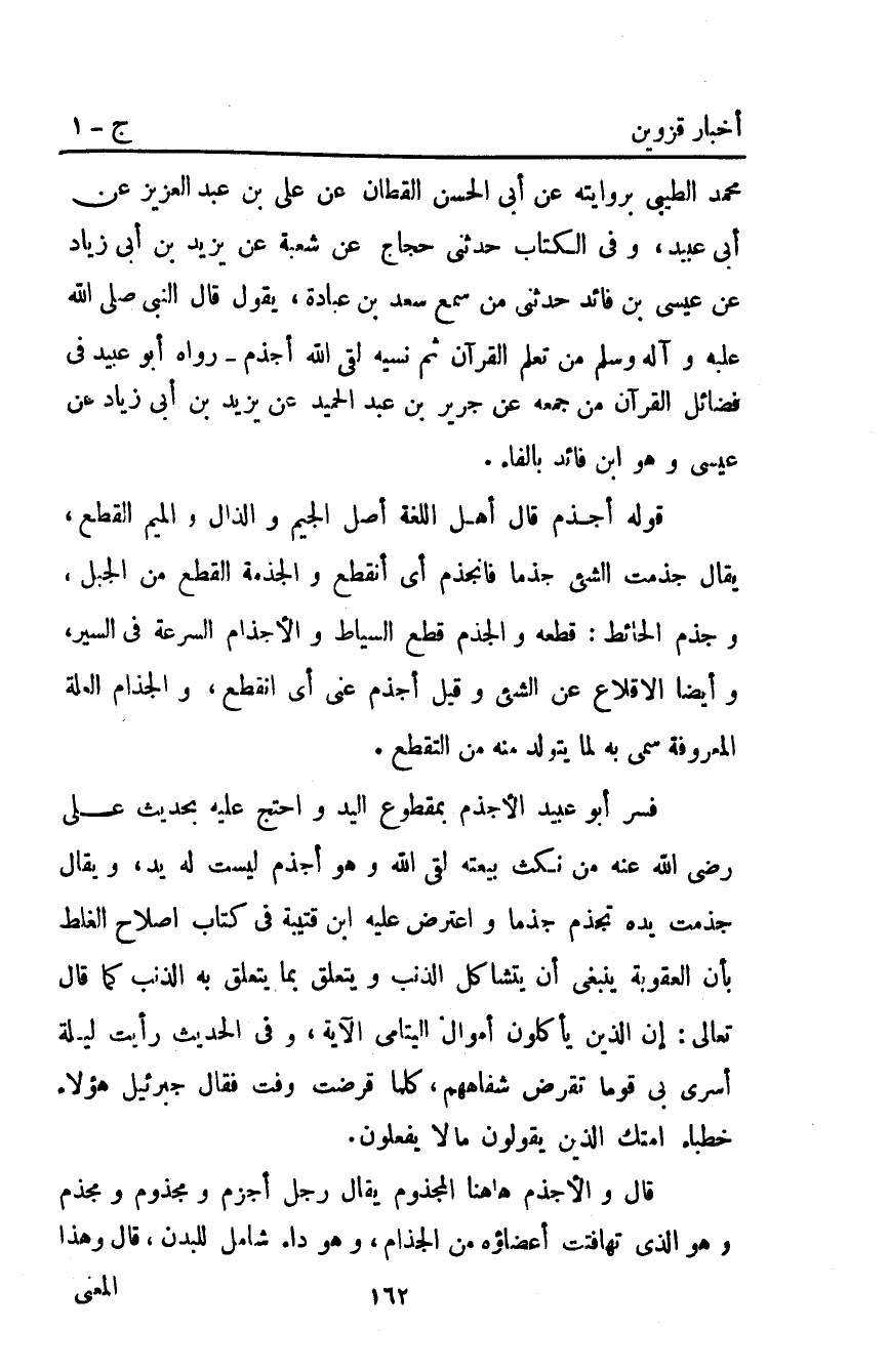 مُحَمَّدٍ الطَّيِّبِيِّ بِرِوَايَتِهِ عَنْ أَبِي الْحَسَنِ الْقَطَّانِ عَنْ عَلِيِّ بْنِ عَبْدِ الْعَزِيزِ عَنْ أَبِي عُبَيْدٍ وَفِي الْكِتَابِ حَدَّثَنِي حَجَّاجٌ عَنْ شُعْبَةَ عَنْ يَزِيدَ بْنِ أَبِي زِيَادٍ عَنْ عِيسَى بْنِ فَائِدٍ حَدَّثَنِي مَنْ سَمِعَ سَعْدَ بْنَ عُبَادَةَ يَقُولُ قَالَ النَّبِيُّ صَلَّى اللَّهُ عَلَيْهِ وَآلِهِ وَسَلَّمَ: "مَنْ تَعَلَّمَ الْقُرْآنَ ثُمَّ نَسِيَهُ لَقِيَ اللَّهَ أَجْذَمَ". رواه أبو عبيد في فضائل القرآن من جمعه عن جرير بْن عَبْد الحميد عَنْ يَزِيدَ بْنِ أَبِي زِيَادٍ عن عيسى وهو ابن فائد بالفاء.