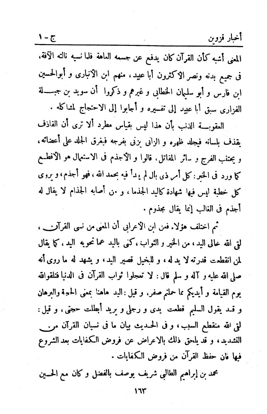 ثم اختلف هؤلاء فعن ابن الأعرابي أن المعنى من نسي القرآن لقي اللَّه خالي اليد من الخير والثواب كنى باليد عما تحويه اليد كما يقال لمن انقطعت قدرته لا يد له وللبخيل قصير اليد ويشهد له ما روى أنه صلى اللَّه عليه واله وَسَلَّمَ قَالَ: "لا تعجلوا ثواب القرآن في الدنيا فتلقوا اللَّه يوم القيامة وأيديكم مما حملتم صفر". وقيل: اليد هاهنا بمعنى الحجة والبرهان وقد يقول السليم قطعت يدي ورجلي ويريد أبطلت حجتي وقيل لقي اللَّه منقطع السبب وفي الحديث بيان ما في نسيان القرآن من التشديد وقد يلحق ذلك بالإعراض عن فروض الكفايات بعد الشروع فيها فإن حفظ القرآت من فروض الكفايات.