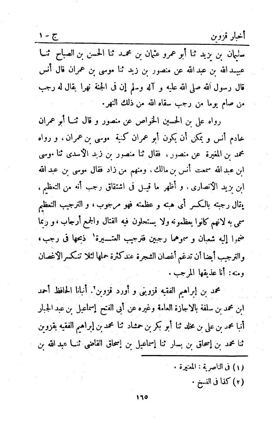 رَوَاهُ عَلِيُّ بْنُ الْحُسَيْنِ الْخَوَّاصُ عَنْ مَنْصُورٍ وَقَالَ ثنا أَبُو عِمْرَانَ خَادِمُ أَنَسٍ وَيُمْكِنُ أَنْ يَكُونَ أَبُو عِمْرَانَ كُنْيَةَ مُوسَى بْنِ عِمْرَانَ وَرَوَاهُ مُحَمَّدُ بْنُ الْمُغِيرَةِ عَنْ مَنْصُورٍ فَقَالَ ثنا مَنْصُورُ بْنُ زَيْدٍ الأَسَدِيُّ ثنا موسى ابن عَبْدِ اللَّهِ سَمِعْتُ أَنَسَ بْنَ مَالِكٍ وَمِنْهُمْ مَنْ زَادَ فَقَالَ موسى بن عبد الله ابن يَزِيدَ الأَنْصَارِيُّ وَأَظْهَرُ مَا قِيلَ فِي اشْتِقَاقِ رَجَبٍ أَنَّهُ مِنَ التعظيم يقال رجبته بالكسر أي هبته وعظمته فهو مرجوب والترجيب التعظيم سمي به لأنهم كانوا يعظمونه ولا يستحلون فيه القتال والجمع أرجاب وربما ضموا إليه شعبان وسموهما رجبين فترجيب العتيرة1 ذبحها في رجب والترجيب أيضا أن تدغم أغصان الشجرة عند كثرة حملها لئلا تنكسر الأغصان ومنه أنا عذيقها المرجب.