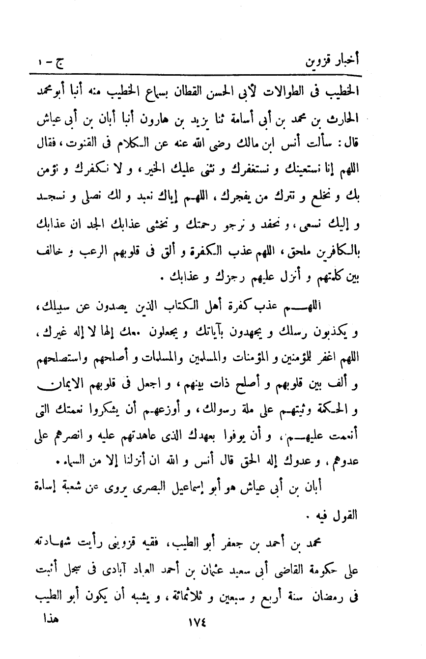 الخطيب في الطوالات لأبي الحسن القطان بسماع الخطيب منه أَنْبَأَ أَبُو مُحَمَّدٍ الْحَارِثُ بْنُ مُحَمَّدِ بْنِ أَبِي أُسَامَةَ ثَنَا يَزِيدُ بْنُ هَارُونَ أَنْبَأَ أَبَانُ بْنُ أَبِي عَيَّاشٍ قَالَ سَأَلْتُ أَنَسَ بْنِ مَالِكٍ رَضِيَ اللَّهُ عَنْهُ عَنِ الْكَلامِ فِي الْقُنُوتِ فَقَالَ: اللَّهُمَّ إِنَّا نَسْتَعِينُكَ وَنَسْتَغْفِرُكَ وَنُثْنِي عَلَيْكَ الْخَيْرَ وَلا نَكْفُرُكَ وَنُؤْمِنُ بِكَ وَنَخْلَعُ وَنَتْرُكُ مَنْ يَفْجُرُكَ اللَّهُمَّ إِيَّاكَ نَعْبُدُ وَلَكَ نُصَلِّي وَنَسْجُدُ وَإِلَيْكَ نَسْعَى وَنَحْفِدُ وَنَرْجُو رَحْمَتَكَ وَنَخْشَى عَذَابَكَ الْجَدَّ إِنَّ عَذَابَكَ بِالْكَافِرِينَ مُلْحِقٌ اللَّهُمَّ عَذِّبِ الْكَفَرَةَ وَأَلْقِ فِي قُلُوبِهِمُ الرُّعْبَ وَخَالِفْ بَيْنَ كَلِمَتِهِمْ وَأَنْزِلْ عَلَيْهِمْ رِجْزَكَ وَعَذَابَكَ.
