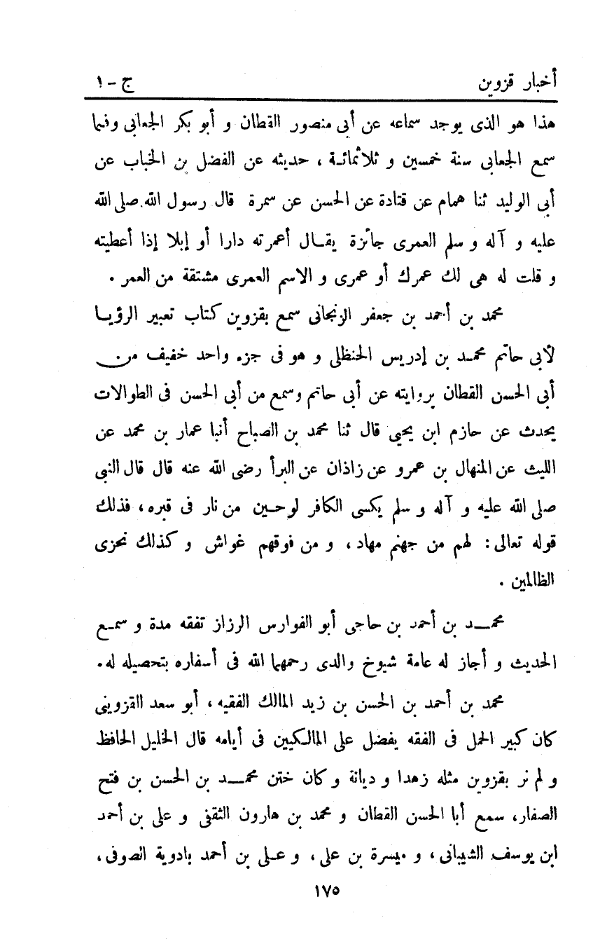 مُحَمَّد بْن أَحْمَدَ بْن جعفر الزنجاني سمع بقزوين كتاب تعبير الرؤيا لأبي حاتم مُحَمَّد بْن إدريس الحنظلي وهو في جزء واحد خفيف من أبي الحسن القطان بروايته عن أبي حاتم وسمع من أبي الحسن في الطوالات يحدث عن حازم ابن يحيى قَالَ ثَنَا محمد بن الصباح أَنْبَأَ عَمَّارُ بْنُ مُحَمَّدٍ عَنِ اللَّيْثِ عَنِ الْمِنْهَالِ بْنِ عَمْرٍو عن زاذان عن البرأ رَضِيَ اللَّهُ عَنْهُ قَالَ: قَالَ النبي صلى اللَّه عيه وآله وَسَلَّمَ: "يُكْسَى الْكَافِرُ لَوْحَيْنِ مِنْ نَارٍ فِي قَبْرِهِ" فَذَلِكَ قَوْلُهُ تَعَالى: {لَهُمْ مِنْ جَهَنَّمَ مِهَادٌ وَمِنْ فَوْقِهِمْ غَوَاشٍ وَكَذَلِكَ نَجْزِي الظَّالِمِينَ} .